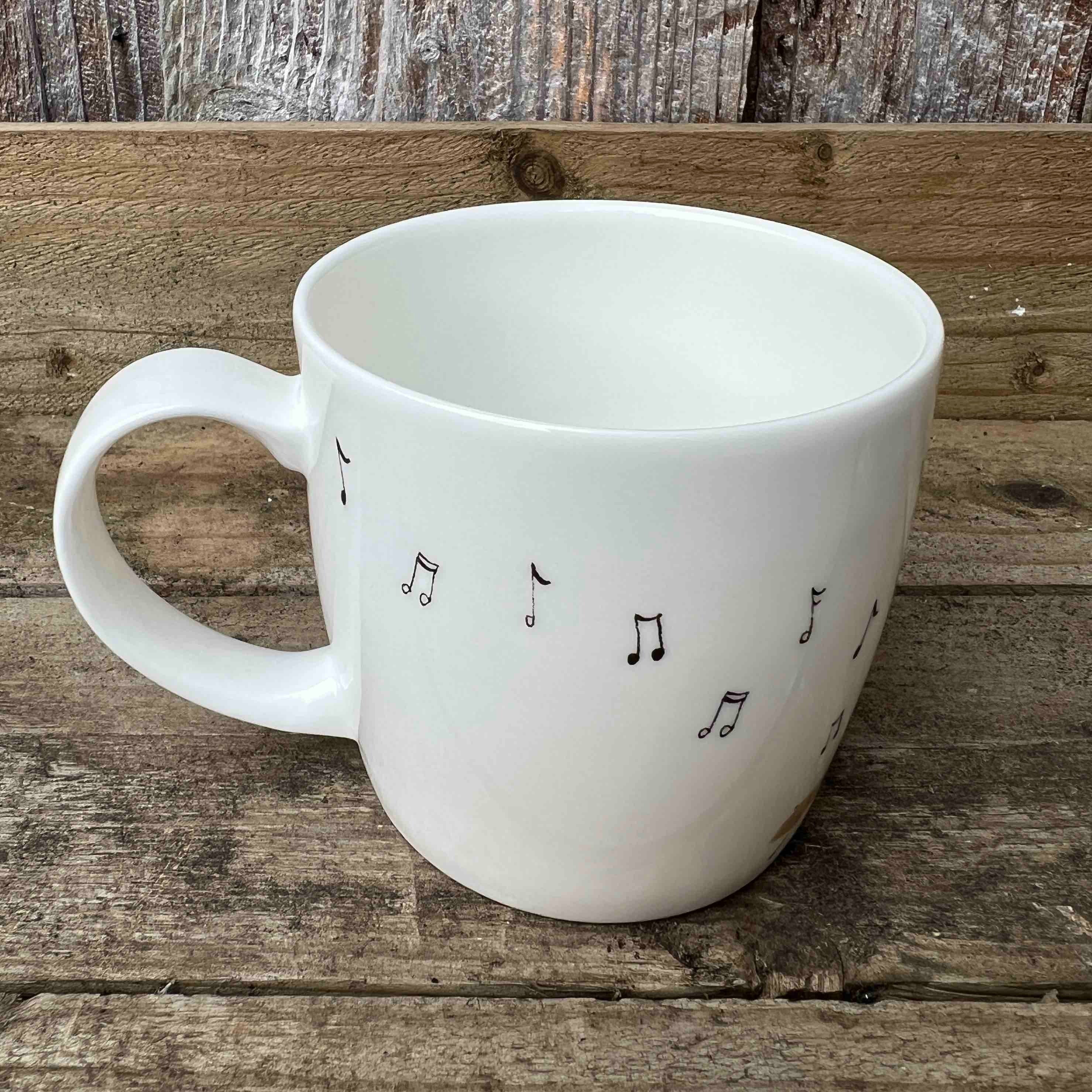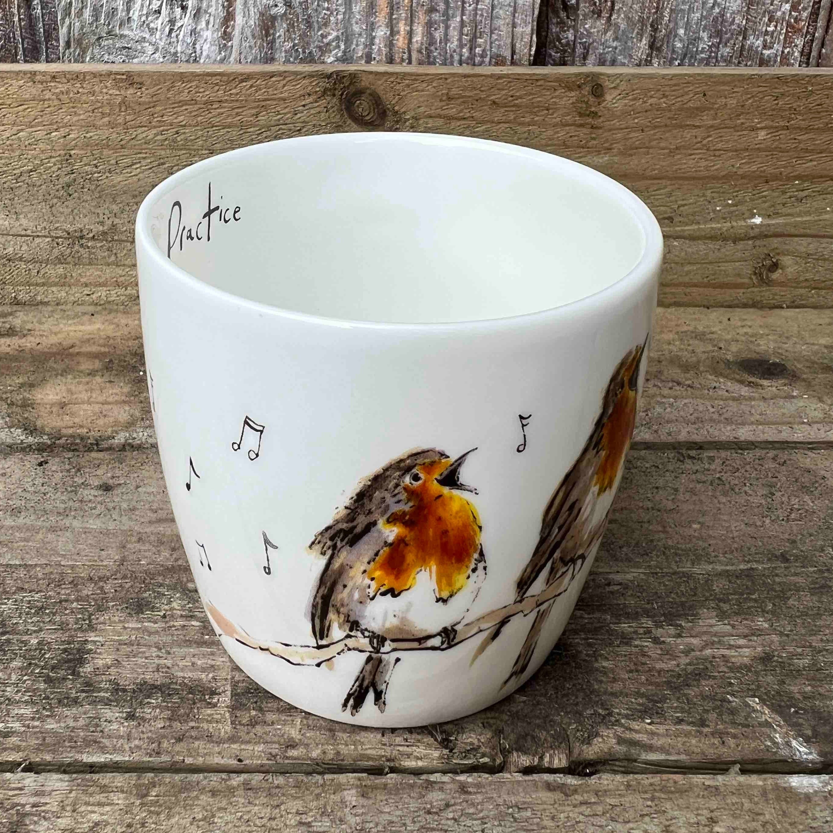 Eine hochwertige Tasse aus "Fine Bone" Porzellan, illustriert mit 2 singenden Vögeln. Am inneren Tassenrand befindet sich ein passender Motto-Text: "choir practive". Ein paar Noten auf dem Tassenboden innen überraschen, wenn du Kaffee oder Tee trinkst...