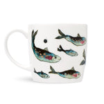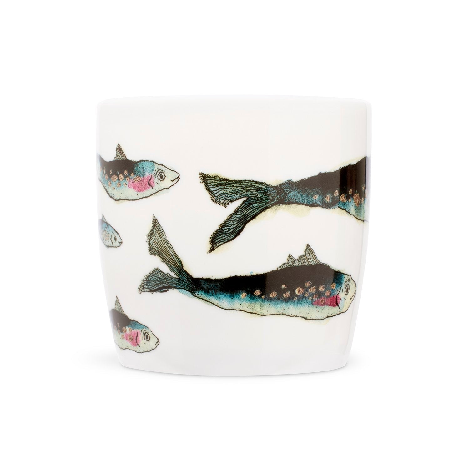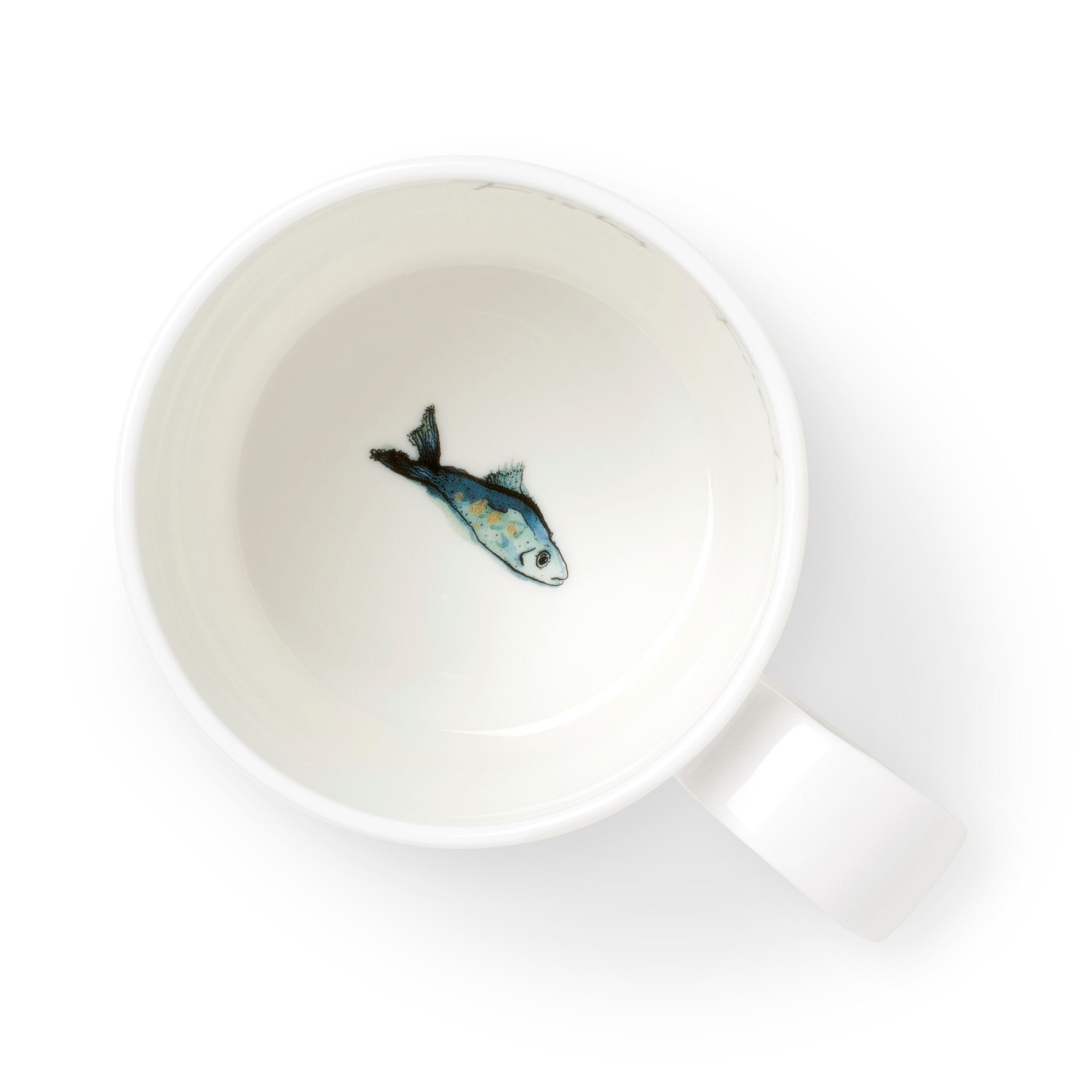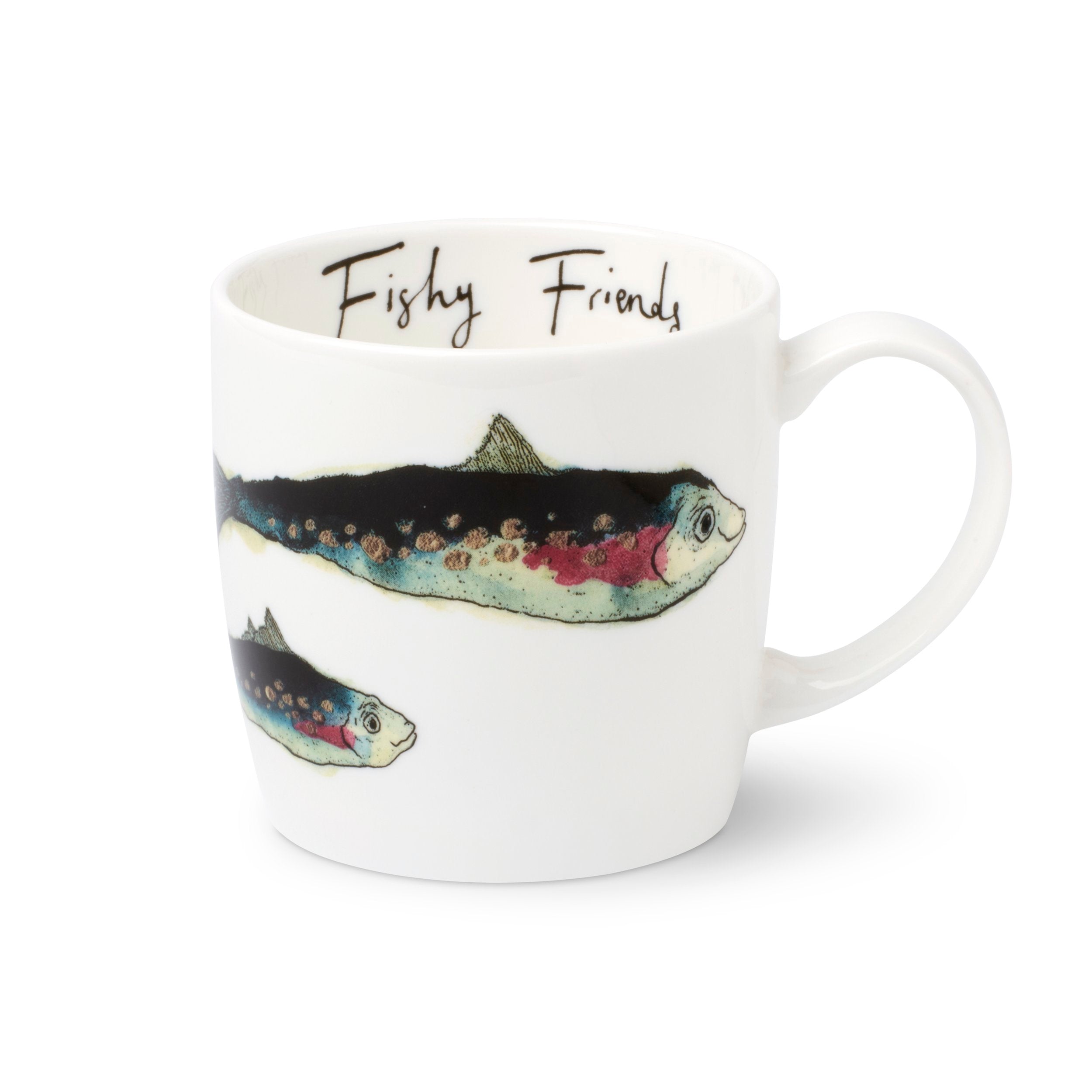 Eine hochwertige Tasse aus "Fine Bone" Porzellan, illustriert mit einem Fischschwarm. Am inneren Tassenrand befindet sich ein passender Motto-Text: "fishy friends". Ein einzelner Fisch auf dem Tassenboden innen überrascht mit Humor, wenn du Kaffee oder Tee trinkst...