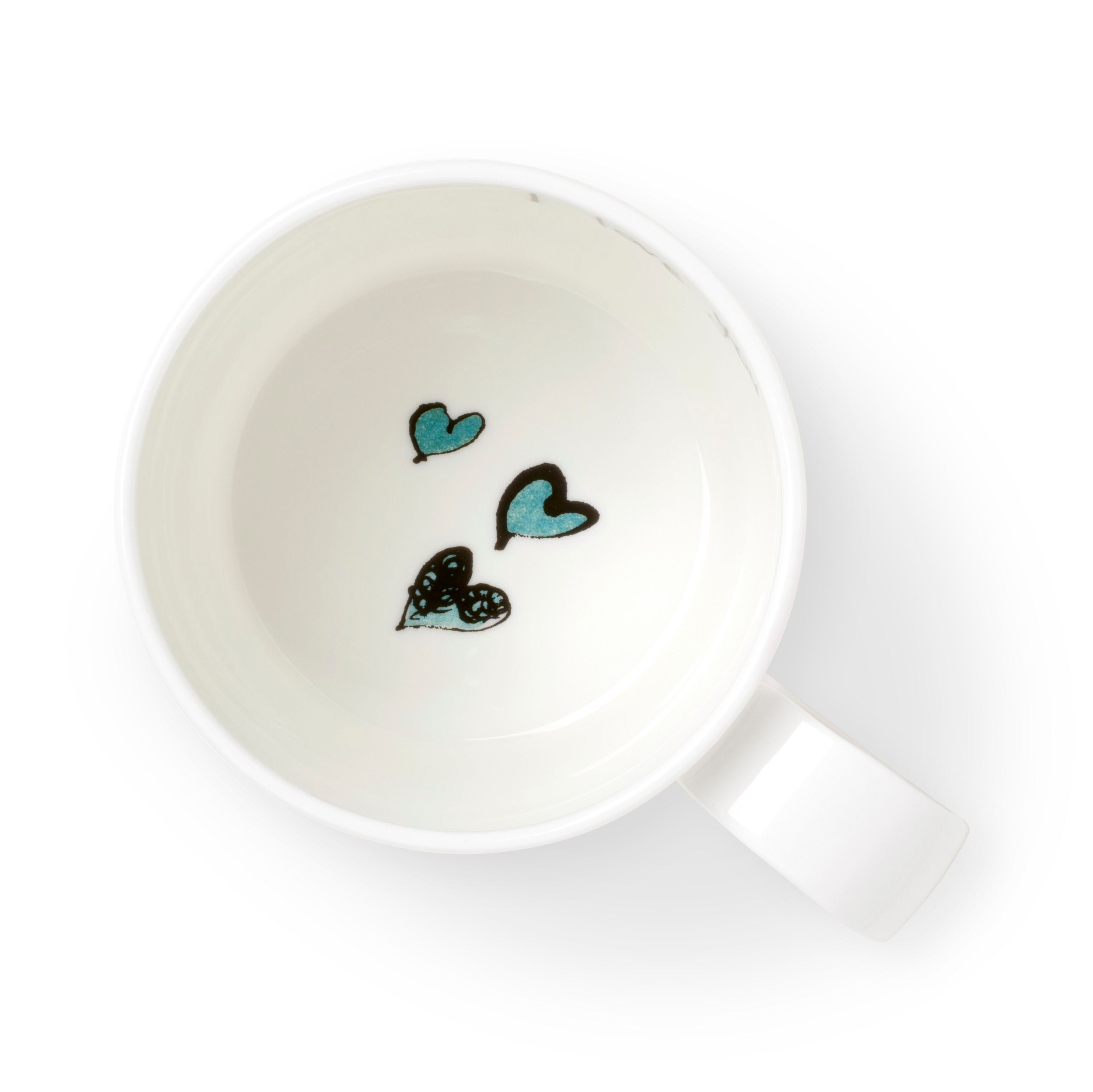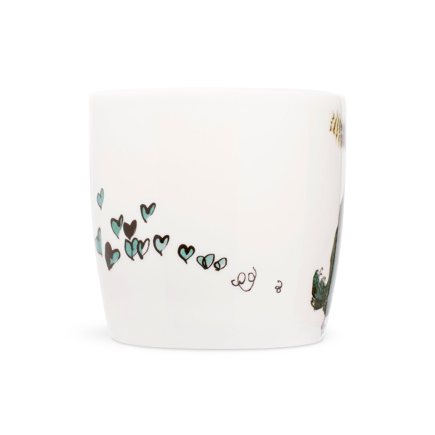 Eine hochwertige Tasse aus "Fine Bone" Porzellan, illustriert mit 2 Enten und Herzen. Am inneren Tassenrand befindet sich ein passender Motto-Text: "i love you". Ein paar Herzen auf dem Tassenboden innen überraschen, wenn du Kaffee oder Tee trinkst...