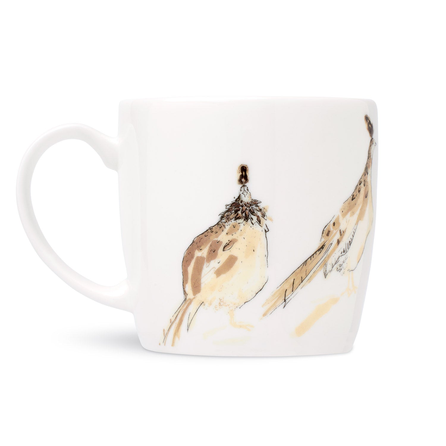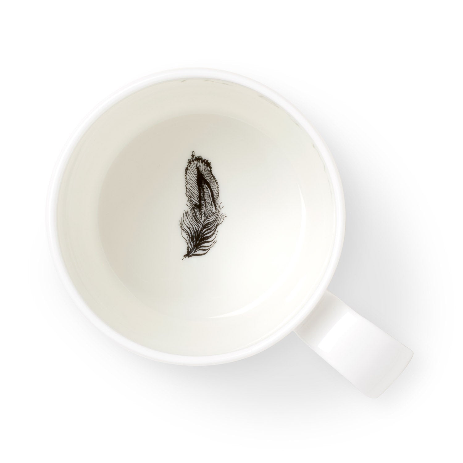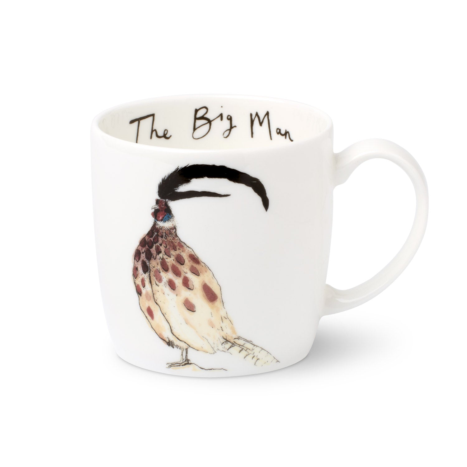 Eine hochwertige Tasse aus "Fine Bone" Porzellan, illustriert mit einer Gruppe von Fasanen. Am inneren Tassenrand befindet sich ein passender Motto-Text: "the big man". Eine Feder auf dem Tassenboden innen überrascht, wenn du Kaffee oder Tee trinkst...