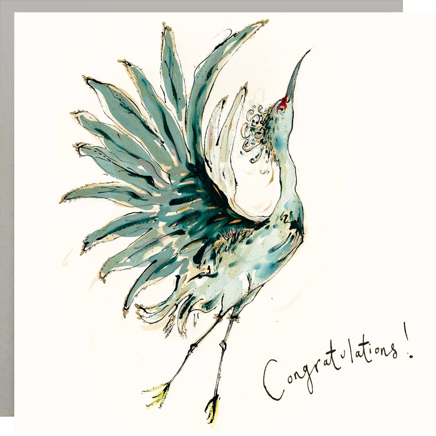 Eine 15x15cm große Grußkarte mit passendem Umschlag. Die Vorderseite ziert ein extravaganter Kranich und ein handgeschriebener Text "Congratulations".