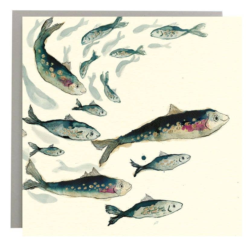 Eine 15x15cm große Grußkarte mit passendem Umschlag. Die Vorderseite ziert ein Fischschwarm.