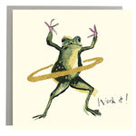 Eine 15x15cm große Grußkarte mit Goldfolien-Prägung und passendem Umschlag. Die Vorderseite ziert ein Frosch mit goldenem Hula-Hoop-Reif und einem dazu passendem Motto-Text: „Work it!“