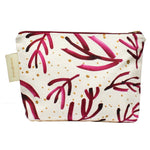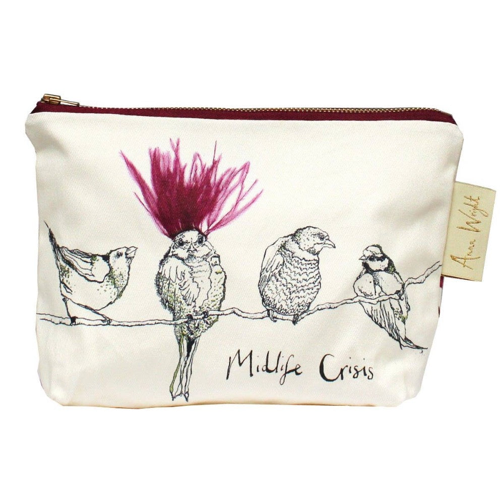 Eine hochwertige Reißverschluss-Tasche illustriert mit einer Gruppe von Gartenvögeln auf der Außenseite, wovon einer einen verrückten Kopfschmuck gewählt hat - passend zum Motto-Text: "Midlife Crisis"
