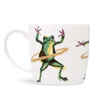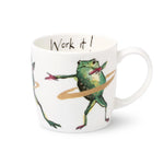 Eine hochwertige Tasse aus "Fine Bone" Porzellan, illustriert mit drei Hula-Hoop-Fröschen auf der Außenseite. Am Inneren Tassenrand befindet sich der handgeschriebene Motto-Text „Work It!“. Ein springender Frosch auf dem inneren Tassenboden, überrascht, wenn du eine Tasse Tee oder Kaffee ausgibst...