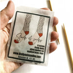 Insgesamt 8 hochwertige Emaille Maschenmarkierern an glatten Metallringen kommen in einer kleinen Papiertüte mit Vintagedruck.