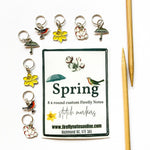 Insgesamt 8 hochwertige Emaille Maschenmarkierer an glatten Metallringen kommen in einer kleinen Papiertüte mit Vintagedruck.