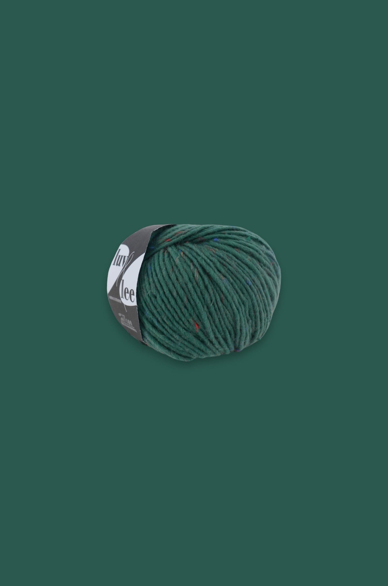 Farbe 2609 ist ein tiefes, kühles Tannengrün mit ruhiger, natürlicher Wirkung. In der Qualität Luv & Lee von Atelier Zitron bringen die bunten Tweed-Sprenkel in Blau, Grün, Rot und Gelb lebendige Akzente ins Maschenbild. So entsteht ein spannender Kontrast: der dunkle, klare Grundton wirkt geerdet, während die Sprenkel für spielerische Leichtigkeit sorgen – perfekt für Projekte mit zeitloser, natürlicher Ausstrahlung.