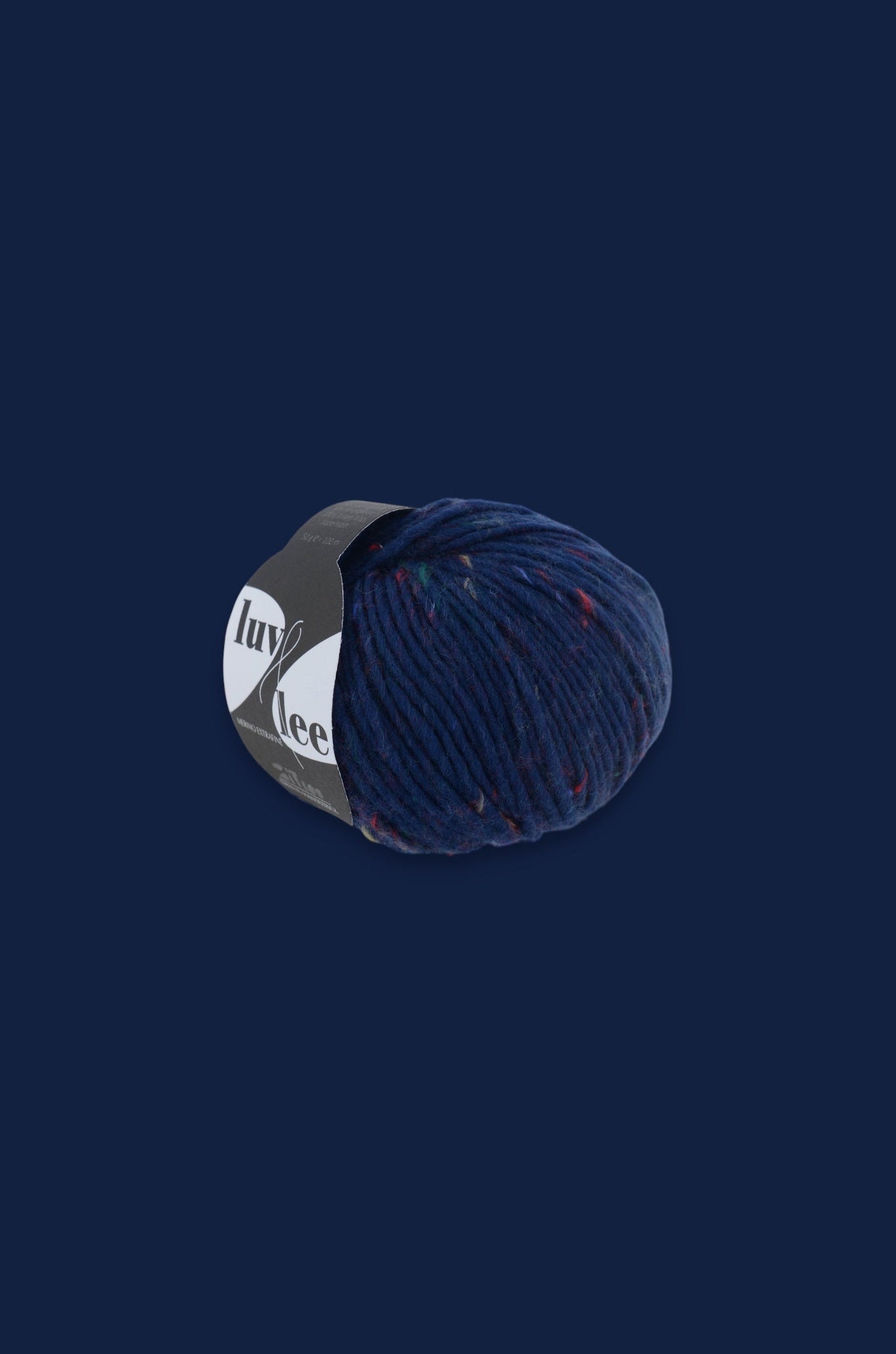Farbe 2611 ist ein schönes Dunkelblau mit klarer, zeitloser Wirkung. In der Qualität Luv & Lee von Atelier Zitron wird dieser Grundton durch die bunten Tweed-Sprenkel in Blau, Grün, Rot und Gelb belebt. So entsteht ein harmonischer Kontrast: das tiefblaue Fundament wirkt ruhig und beständig, während die farbigen Sprenkel dem Ton spielerische Frische verleihen – ideal für Projekte mit klassischem, aber nicht zu strengem Ausdruck.