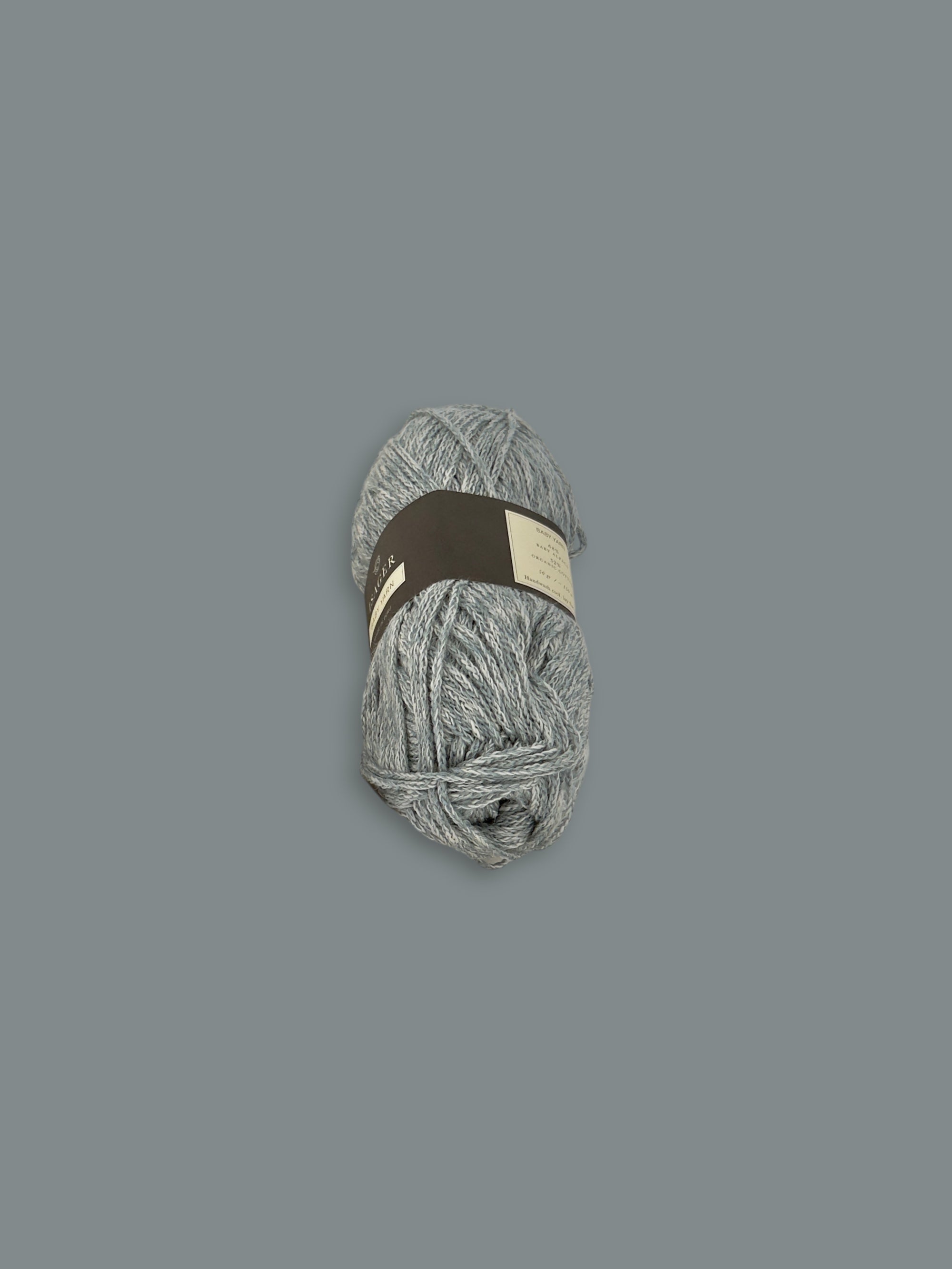 Farbe 10 ist ein gedecktes, kühles Blaugrün mit grauer Basis – erinnert an verwittertes Eisblau oder gedämpftes Salbeigrau. Der cremefarbene Kettenfaden sorgt für ein sanft meliertes Maschenbild und bringt eine feine Helligkeit in den Ton. Die Nuance wirkt ruhig, klar und leicht – ideal für Projekte mit zurückhaltender Farbigkeit und subtiler Frische.
