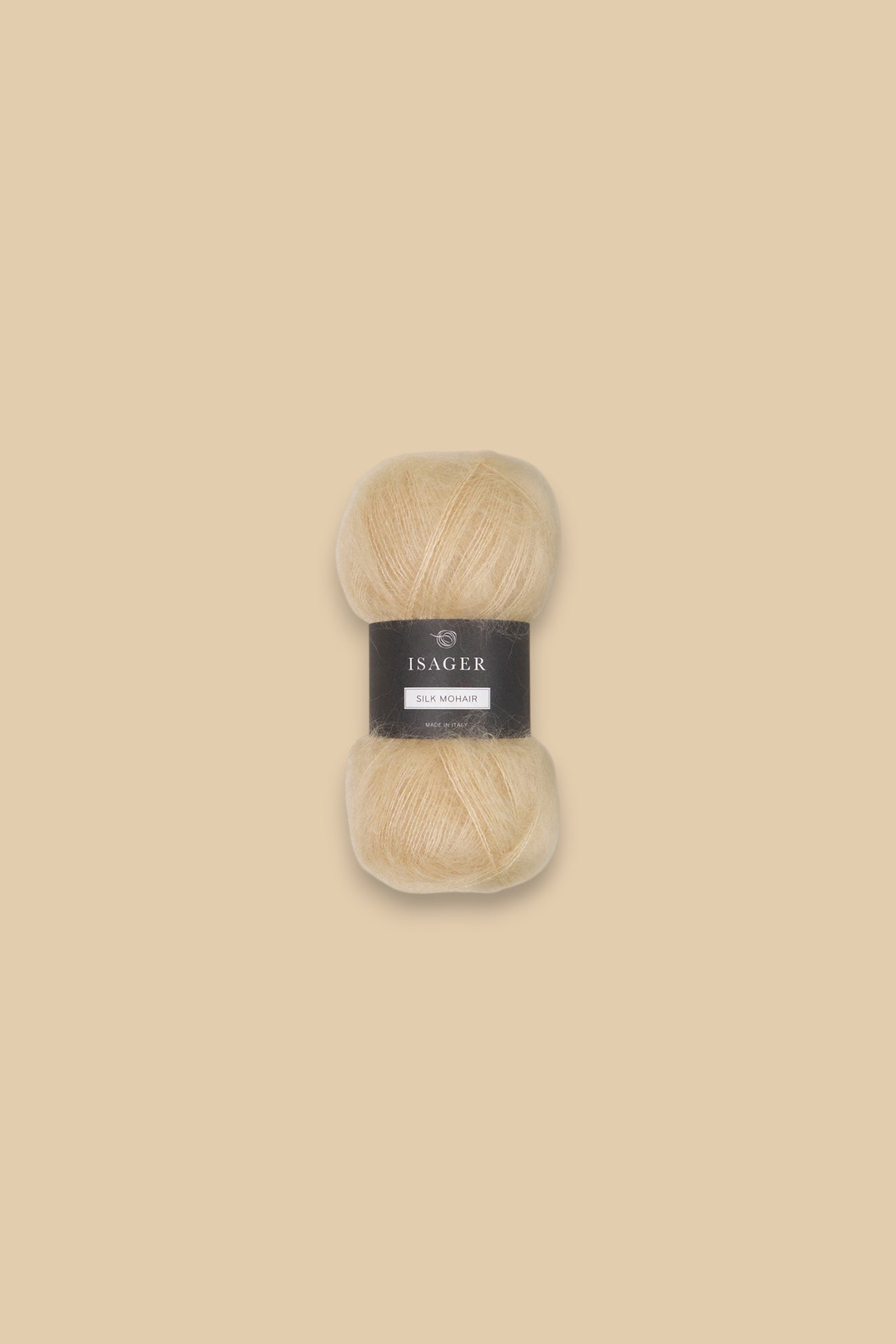Silk Mohair von Isager ist ein edles Garn aus 75 % Super-Kid-Mohair und 25 % Seide – leicht, fluffig und mit einem dezenten, natürlichen Glanz. Es wird in Italien gesponnen und gefärbt und überzeugt durch seine zarte Haptik und luftige Textur.