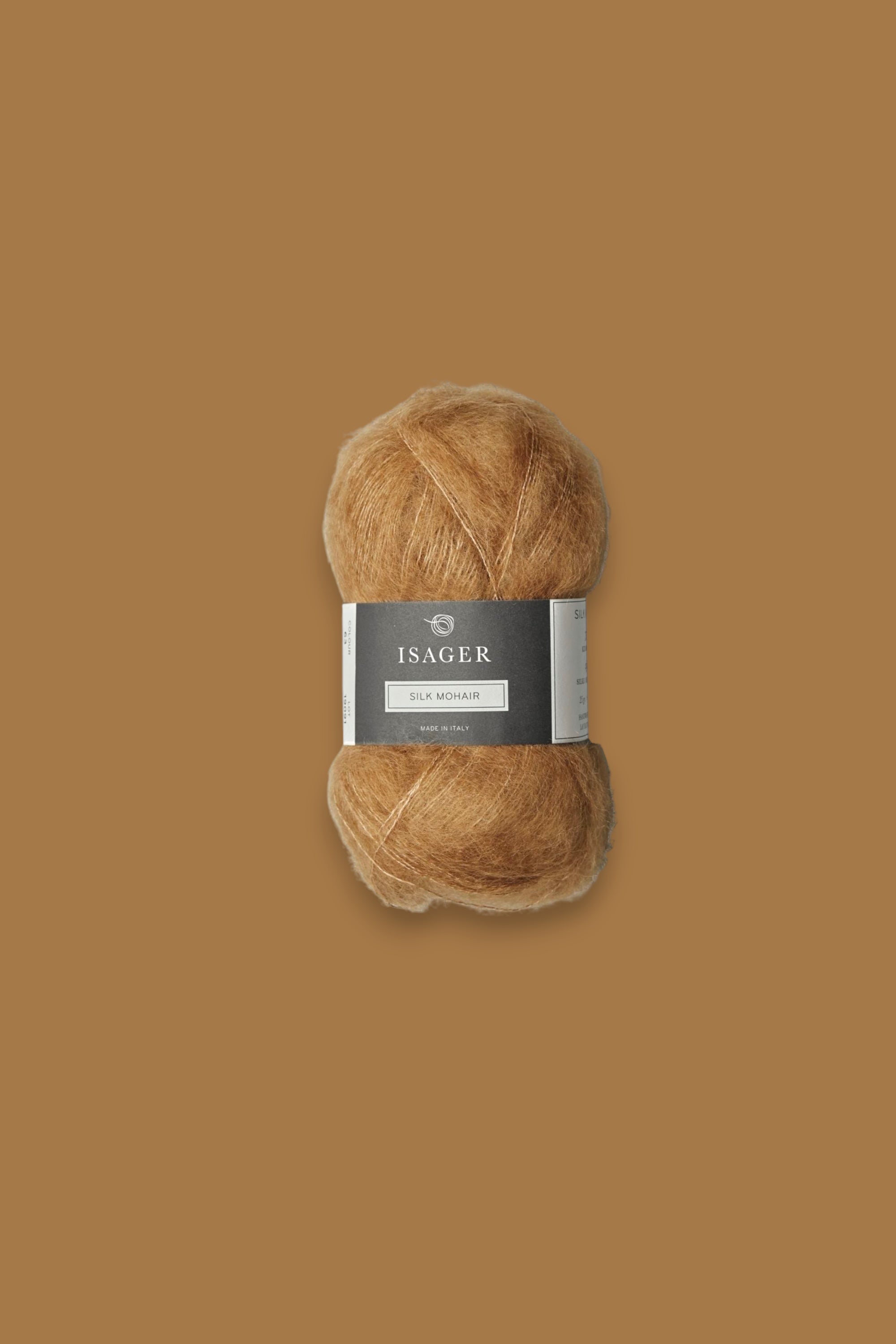 Silk Mohair von Isager ist ein edles Garn aus 75 % Super-Kid-Mohair und 25 % Seide – leicht, fluffig und mit einem dezenten, natürlichen Glanz. Es wird in Italien gesponnen und gefärbt und überzeugt durch seine zarte Haptik und luftige Textur.