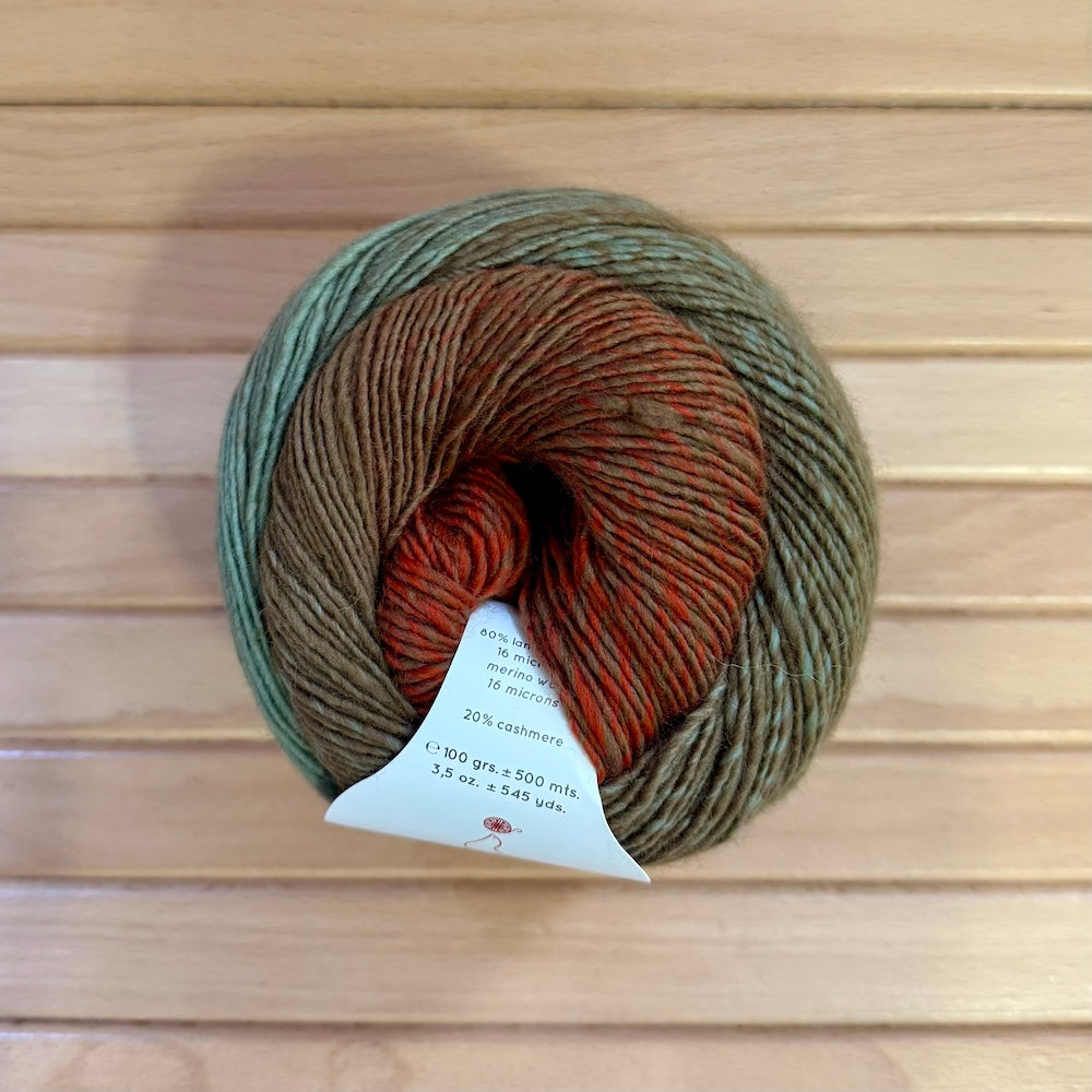 Farbe 103 beginnt in einem gedeckten Grün, führt weiter in ein warmes Braun und endet in einem intensiven Rostrot. Die Übergänge sind weich und erzeugen ein stimmiges, natürliches Farbspiel, das an herbstliche Wälder erinnert. Im Maschenbild wirken die Farben harmonisch aufeinander abgestimmt und verleihen Projekten Tiefe und Wärme.