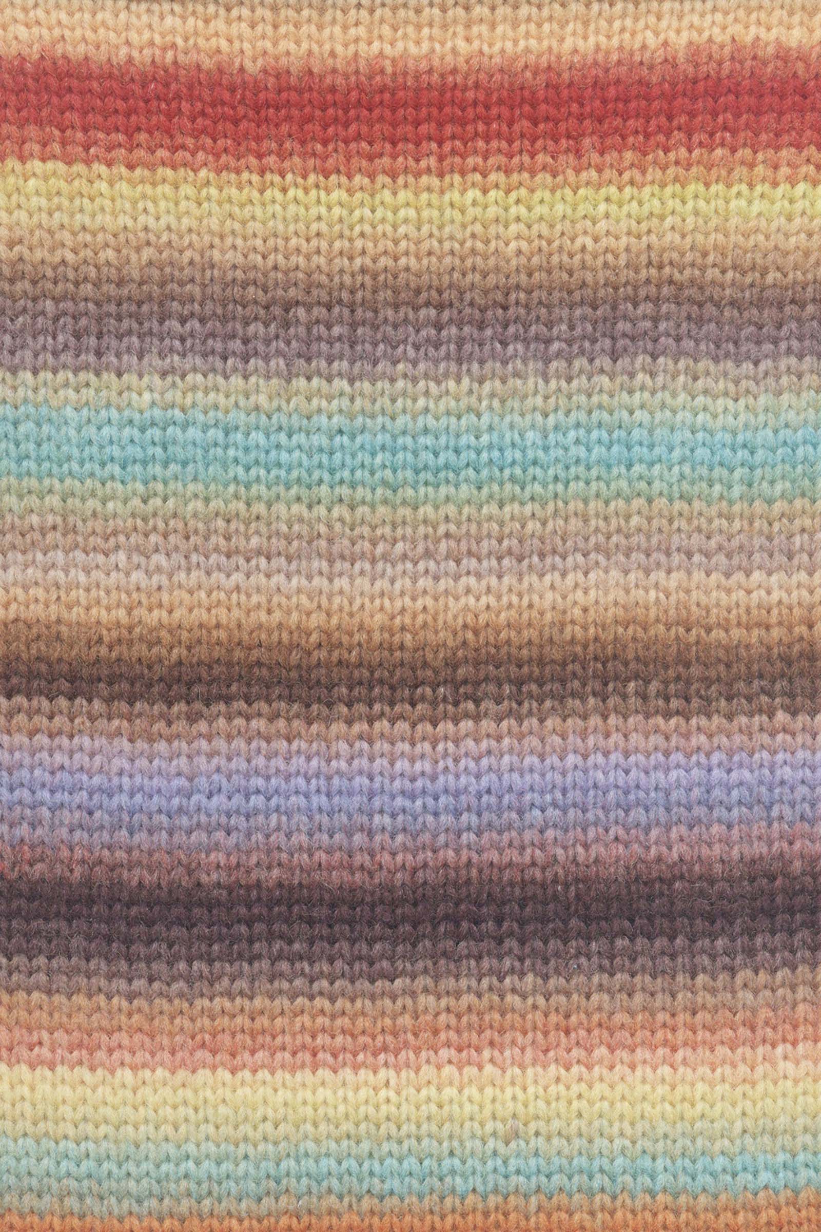 Dieser Farbverlauf vereint sanfte, natürlich wirkende Nuancen von Rostrot, Vanillegelb, Flieder, Himmelblau und Haselnussbraun – wie verblasste Landschaftsaquarelle, der Schimmer von Mineralien oder das Farbspiel eines spätherbstlichen Morgens im Nebel. Die Farben wirken harmonisch, weich und vielschichtig – ideal für Projekte mit ruhiger Lebendigkeit und poetischem Ausdruck. Die Kombination von warmen und kühlen Tönen verleiht dem Garn Tiefe und Wandelbarkeit. Eine stimmige Wahl für alle, die feine Farbverläufe mit sanfter Dynamik und natürlicher Eleganz schätzen.