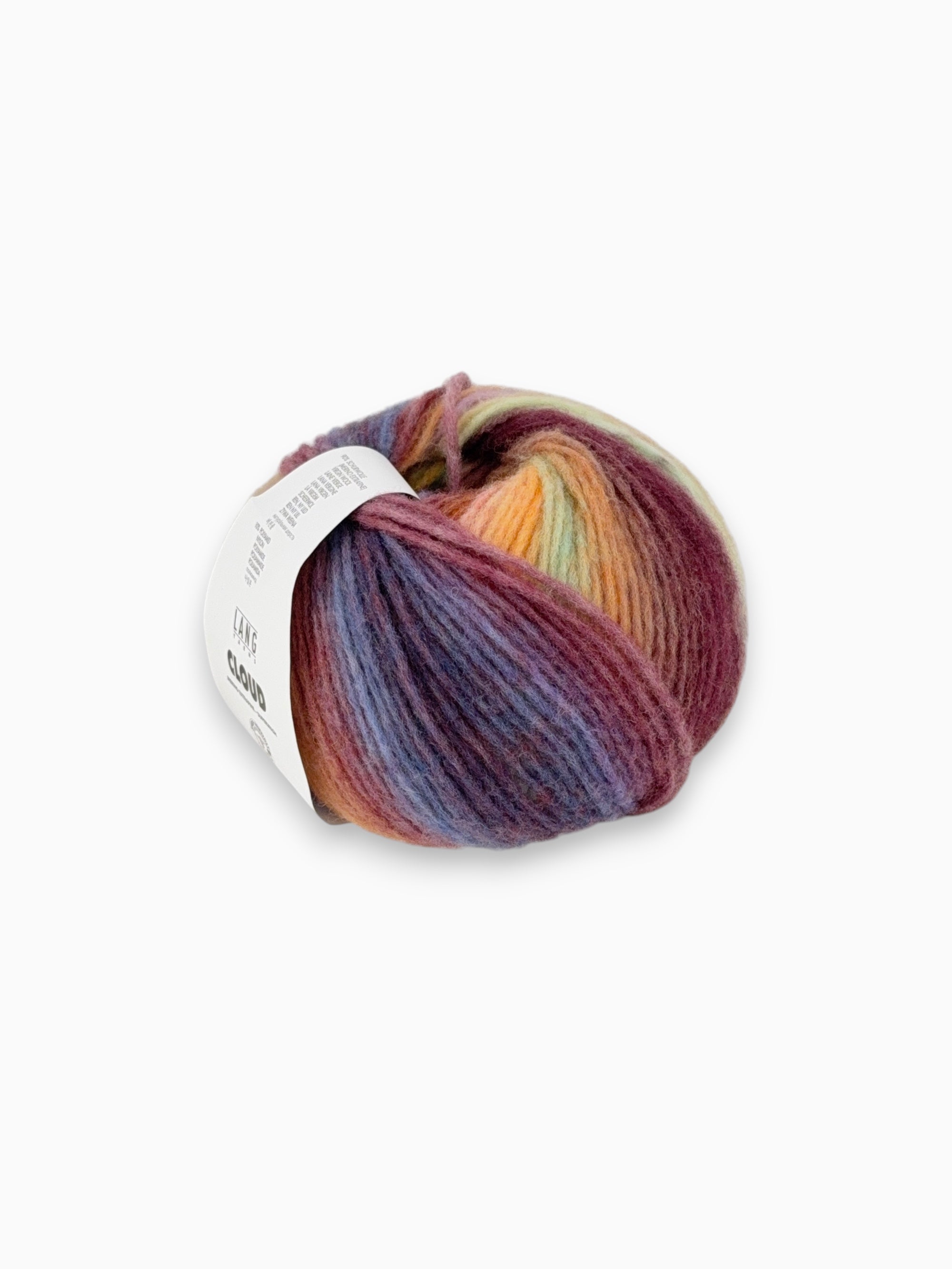 Lang Yarns Cloud ist ein wunderbar weiches Farbverlaufsgarn aus 90 % extrafeiner Merinowolle (mulesingfrei, Superwash) und 10 % Polyamid. Es fühlt sich leicht und voluminös an – ideal für Projekte mit viel Komfort und Charakter. Die Farbverläufe wechseln abwechslungsreich und harmonisch – mal leuchtend, mal sanft – und bringen Bewegung und Ausdruck ins Maschenbild. Mit ca. 260 m Lauflänge pro 100 g-Knäuel und einer empfohlenen Nadelstärke von 7 mm lässt sich Cloud angenehm zügig verarbeiten. Für einen Damenpullover in Größe M reichen bereits vier Knäuel – also 400 g. Die Maschenprobe liegt bei etwa 13 Maschen × 20 Reihen auf 10 × 10 cm. Das Garn ist maschinenwaschbar bei 30 °C im Wollprogramm (ohne Weichspüler) und eignet sich ideal für farbenfrohe Projekte mit unkomplizierter Pflege – vom Oversize-Pullover bis zum Statement-Schal.
