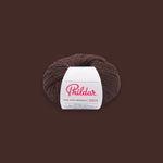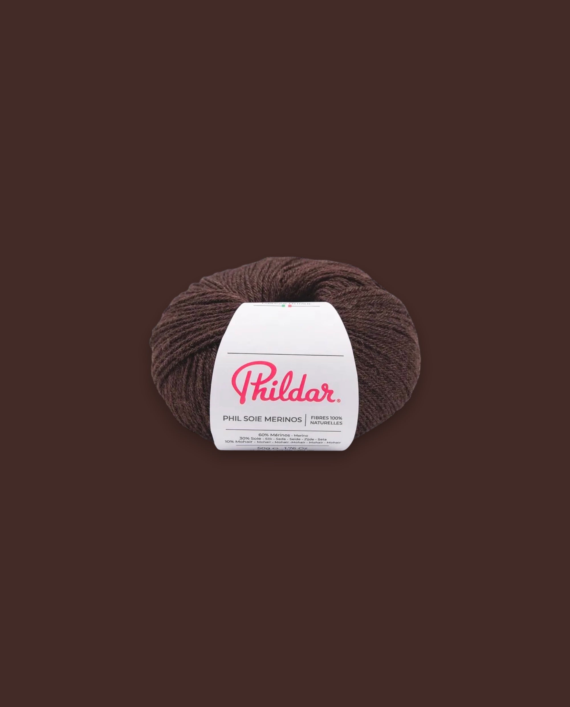 Farbe chocolat noir ist ein tiefes, dunkles Schokoladenbraun mit feiner Melierung, die sanfte Hell-Dunkel-Nuancen entstehen lässt und dem Ton spürbare Tiefe verleiht. In der Qualität Phil Soie Merino von Phildar entsteht daraus ein glattes Maschenbild mit zartem Schimmer, der die warme, edle Anmutung unterstreicht – sinnlich, charaktervoll und zeitlos.