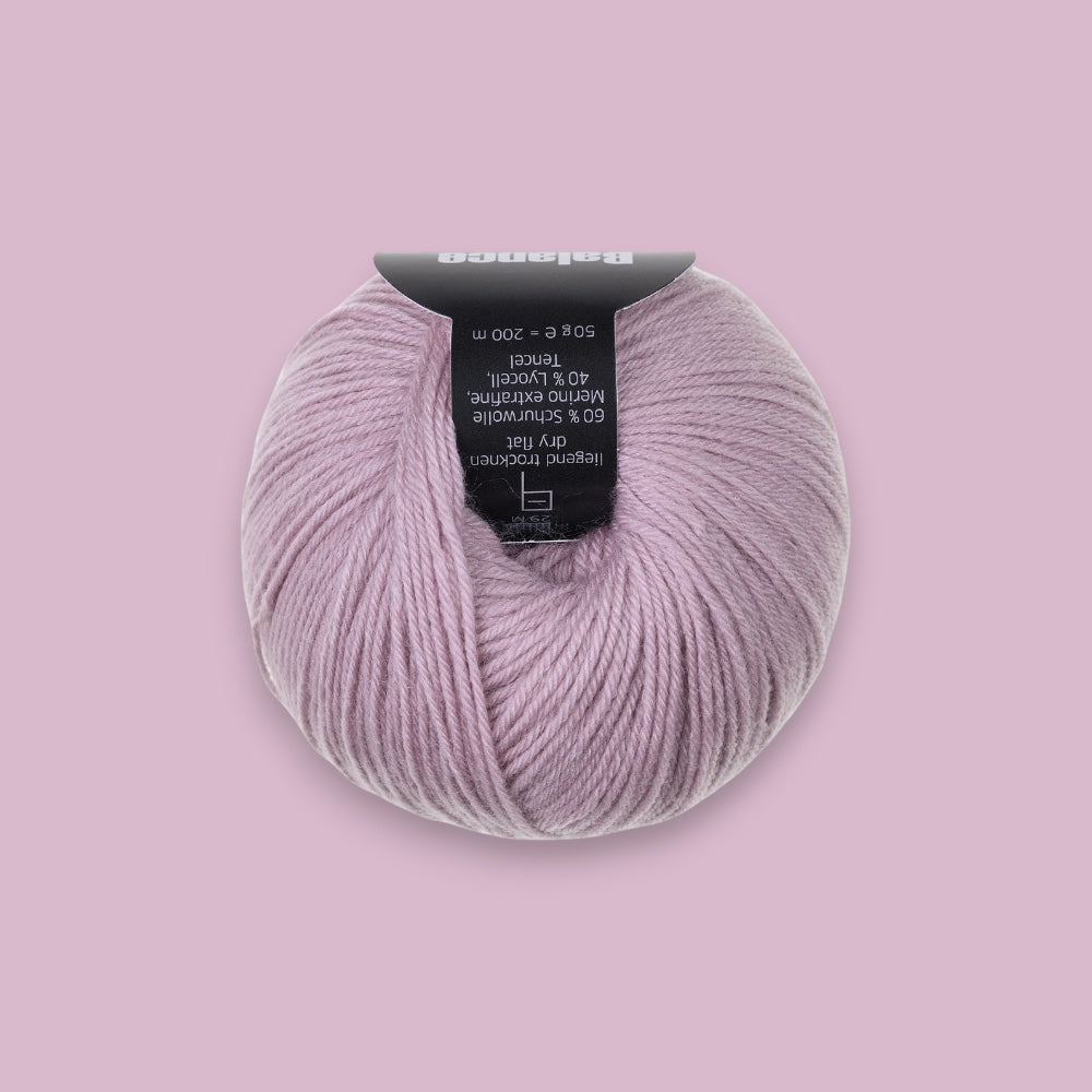Farbe 26 ist ein zartes Rosé mit einem feinen Hauch von Lila, der ihm eine kühle, elegante Note verleiht. Durch den leichten Glanz des Tencel-Anteils erhält die Farbe eine sanfte, seidige Tiefe und wirkt besonders harmonisch auf der glatten Oberfläche des Garns.