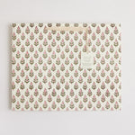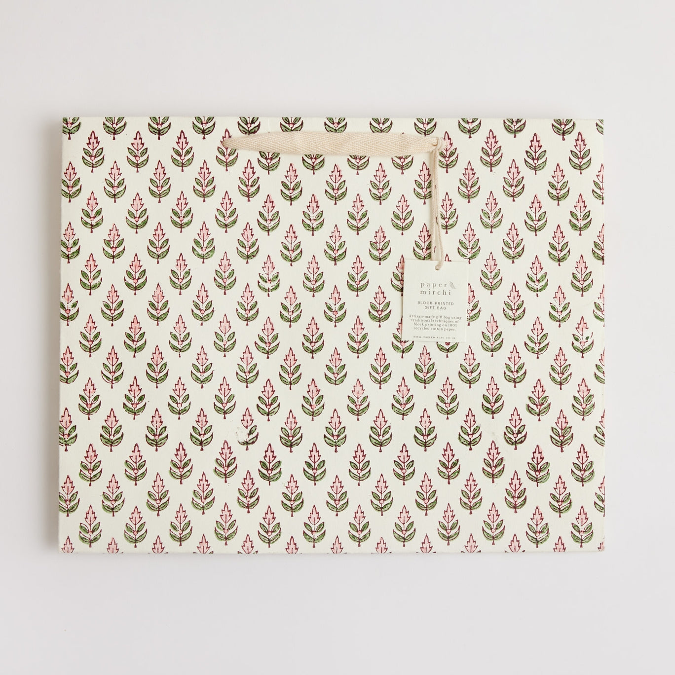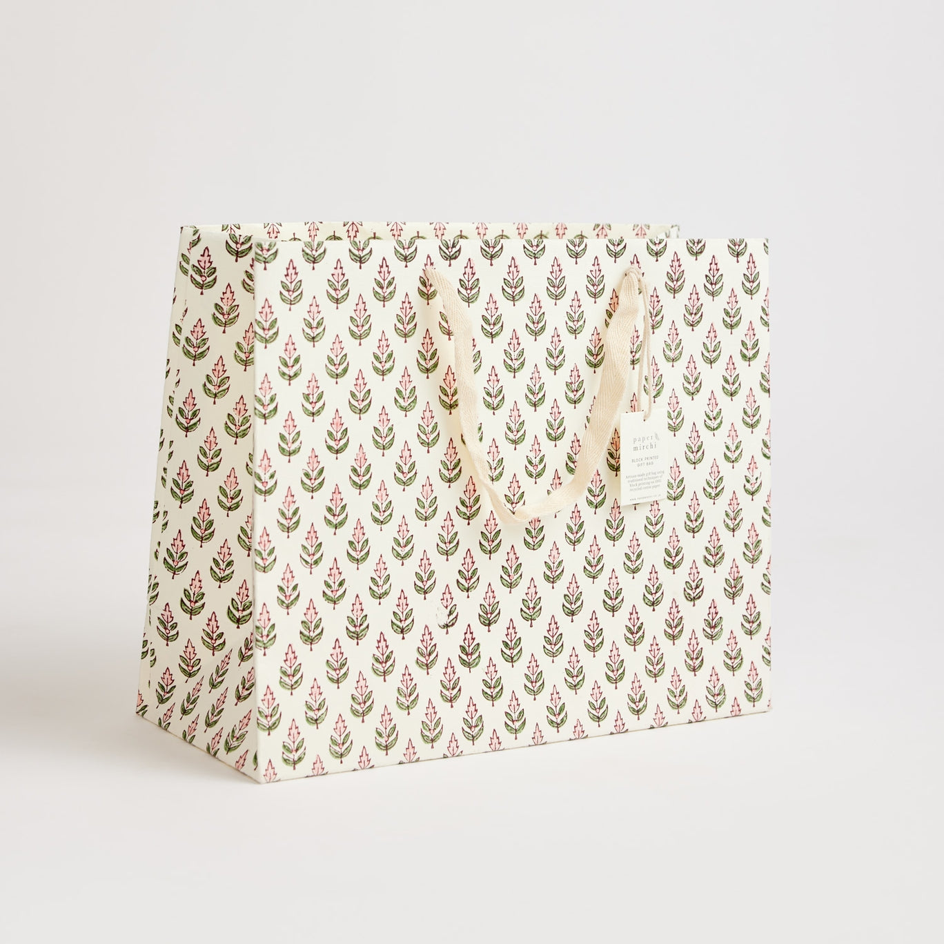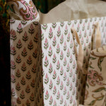 Die wunderschönen und strapazierfähigen Premium-Geschenktüten von Paper Mirchi werden per Handblock auf elfenbeinfarbenes und strapazierfähiges Baumwollpapiertüten mit 2 oder mehr Farben bedruckt. Für jeden Farbauftrag wird ein separater Holzblock verwendet. Symmetrie bildet den Kern des Designs und Musterwiederholungen müssen perfekt ausbalanciert sein. Die Farben werden einzeln gestempelt und es ist ein hohes Maß an Geschick und Präzision erforderlich, um jede Tüte herzustellen.