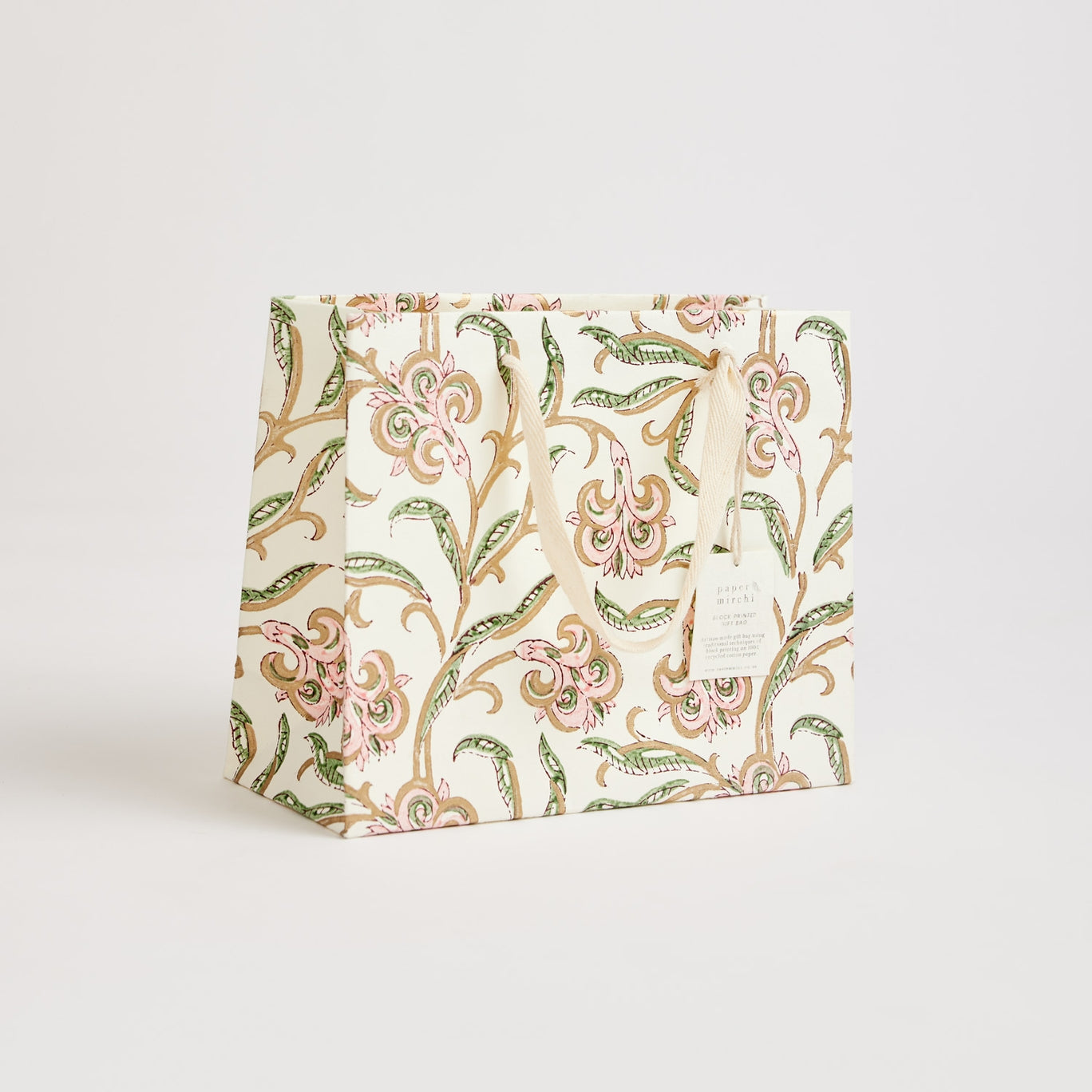 Die wunderschönen und strapazierfähigen Premium-Geschenktüten von Paper Mirchi werden per Handblock auf elfenbeinfarbenes und strapazierfähiges Baumwollpapiertüten mit 2 oder mehr Farben bedruckt. Für jeden Farbauftrag wird ein separater Holzblock verwendet. Symmetrie bildet den Kern des Designs und Musterwiederholungen müssen perfekt ausbalanciert sein. Die Farben werden einzeln gestempelt und es ist ein hohes Maß an Geschick und Präzision erforderlich, um jede Tüte herzustellen.