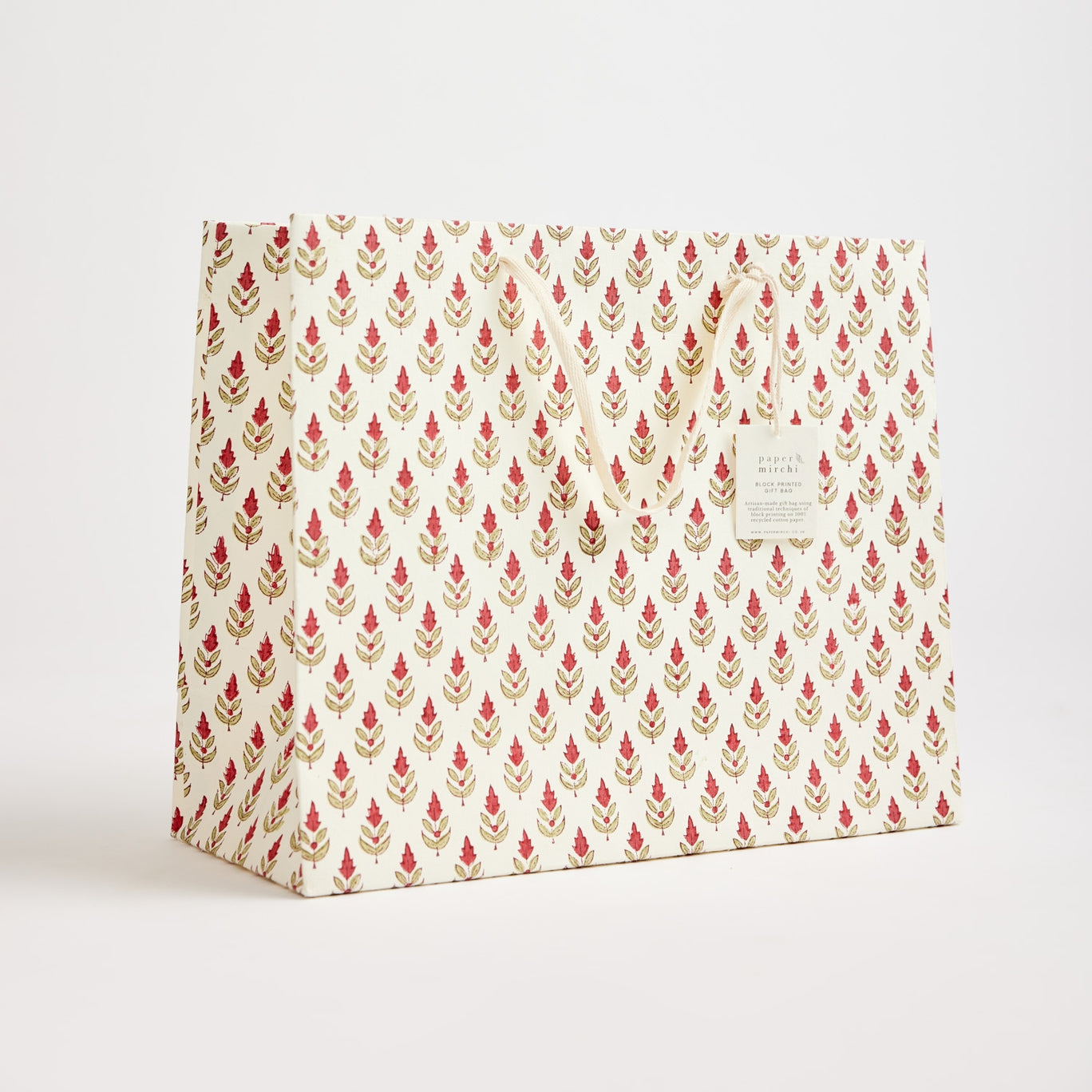 Die wunderschönen und strapazierfähigen Premium-Geschenktüten von Paper Mirchi werden per Handblock auf elfenbeinfarbenes und strapazierfähiges Baumwollpapiertüten mit 2 oder mehr Farben bedruckt. Für jeden Farbauftrag wird ein separater Holzblock verwendet. Symmetrie bildet den Kern des Designs und Musterwiederholungen müssen perfekt ausbalanciert sein. Die Farben werden einzeln gestempelt und es ist ein hohes Maß an Geschick und Präzision erforderlich, um jede Tüte herzustellen.