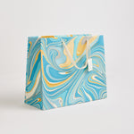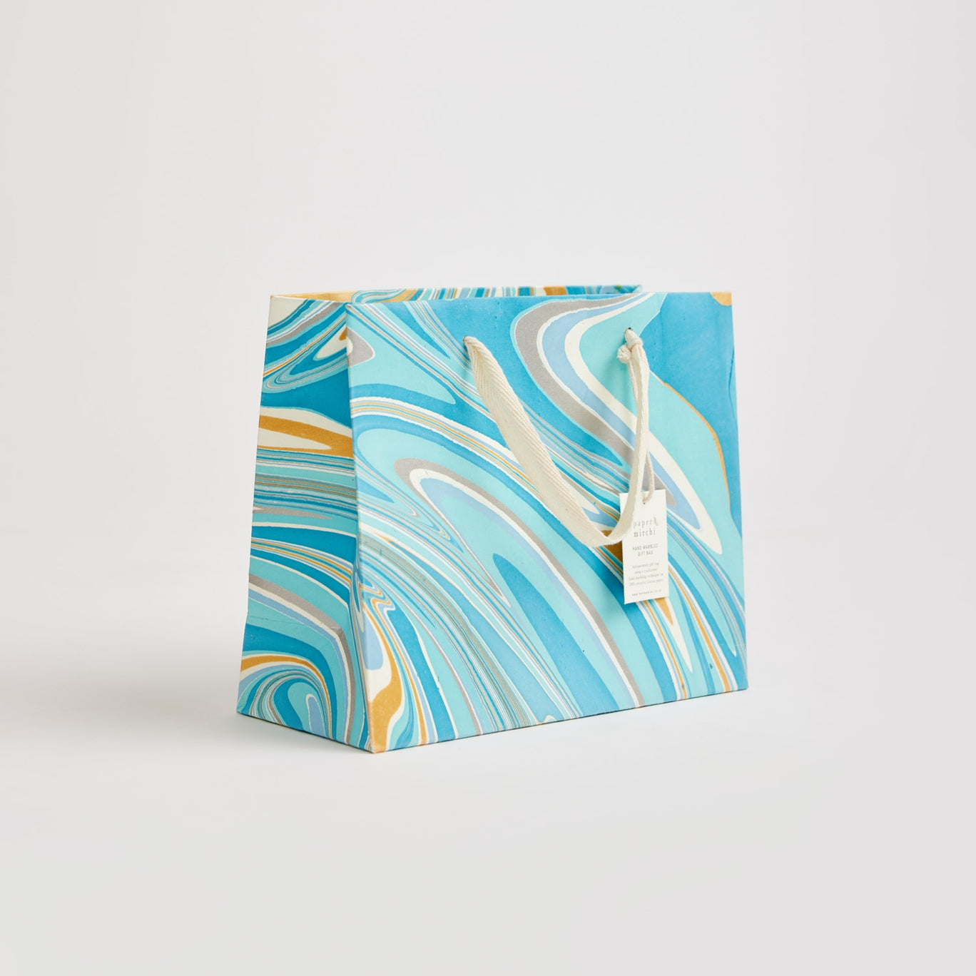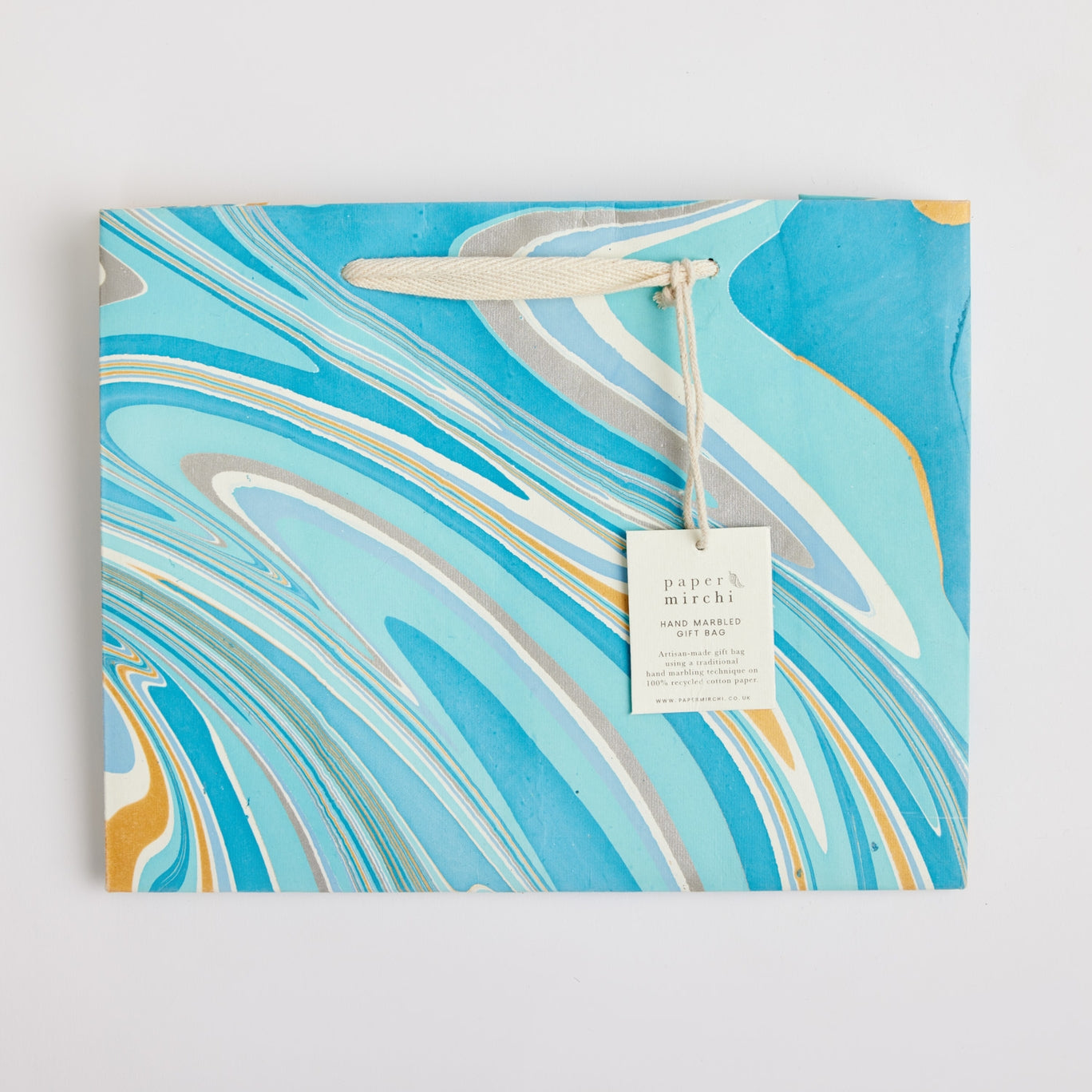 Die wunderschönen und strapazierfähigen Premium-Geschenktüten von Paper Mirchi aus elfenbeinfarbenem und strapazierfähiges Baumwollpapier werden von Hand marmoriert. Sie werden nicht siebgedruckt oder digital in Massenproduktion hergestellt. Dieses wunderschöne, frei fließende, von Hand marmorierte Design eignet sich für jeden Anlass.