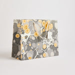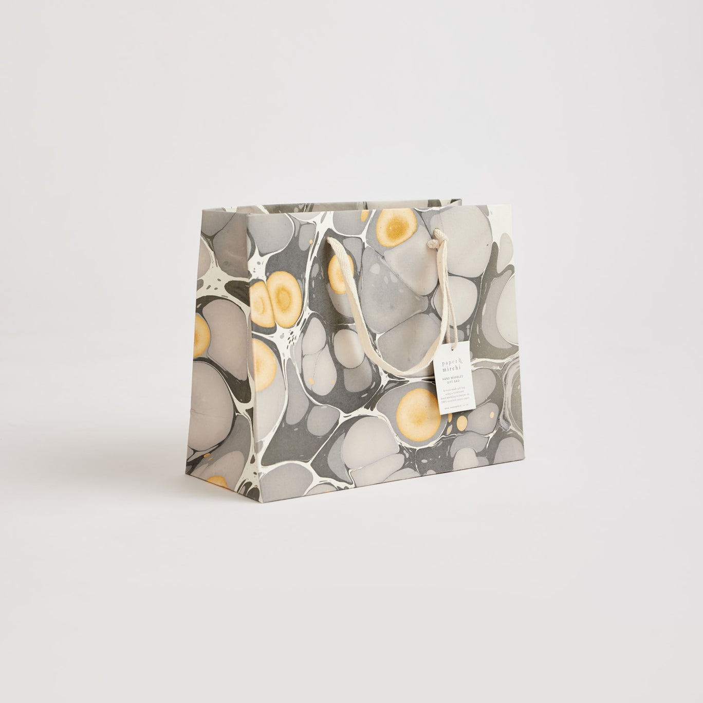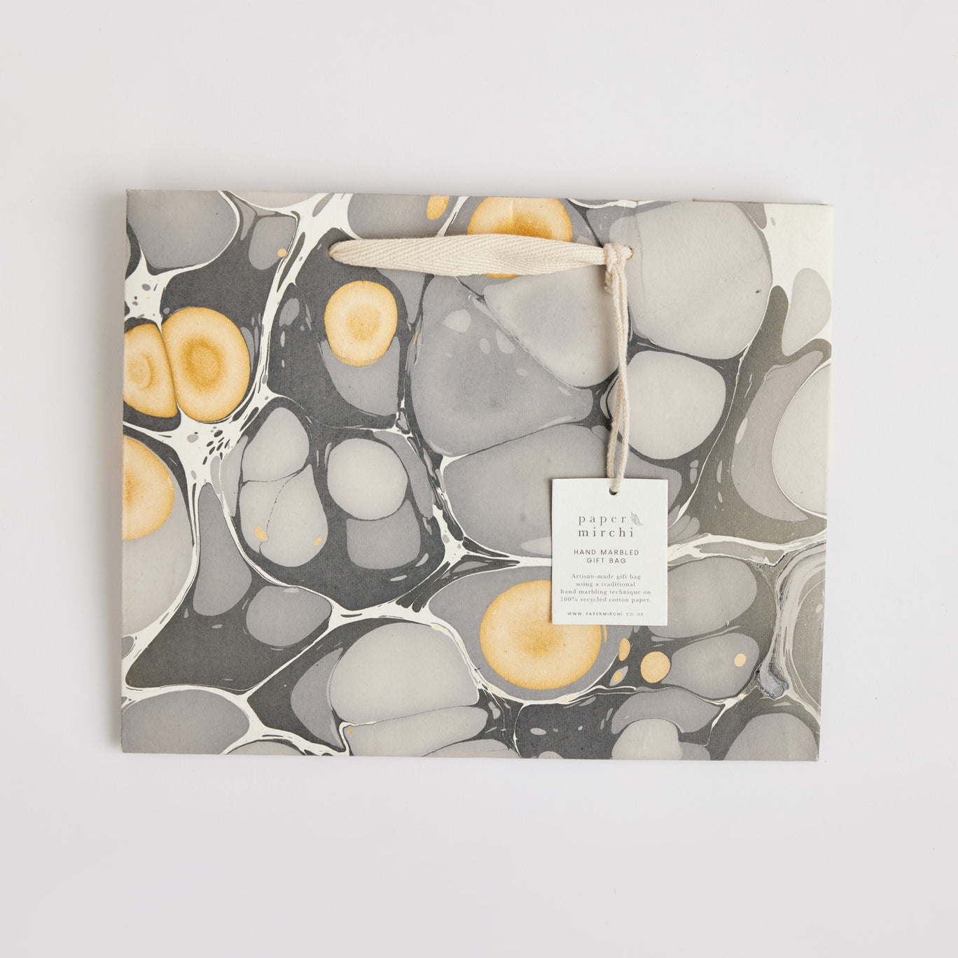 Die wunderschönen und strapazierfähigen Premium-Geschenktüten von Paper Mirchi aus elfenbeinfarbenem und strapazierfähiges Baumwollpapier werden von Hand marmoriert. Sie werden nicht siebgedruckt oder digital in Massenproduktion hergestellt. Dieses wunderschöne, frei fließende, von Hand marmorierte Design eignet sich für jeden Anlass.