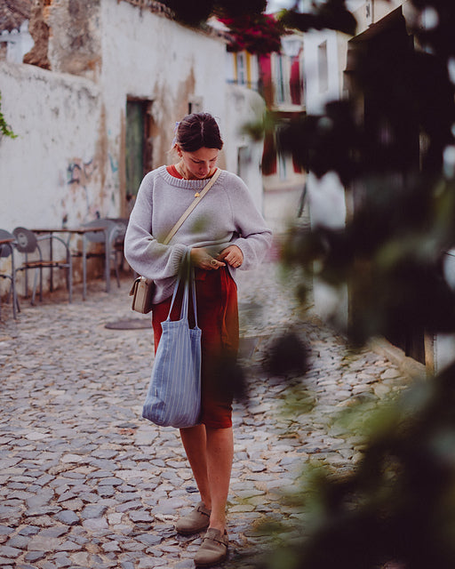 Den Cinema Sweater von Veronika Lindberg strickst Du nahtlos von oben nach unten mit Nadelstärke 4,5mm (Bündchen 3mm) doppelfädig. Die Passe strickst Du mit Raglanzunahmen, ein paar verkürzte Reihen nach dem doppelten Halsbündchen sorgen für eine angenehme Passform. Veronika’s Pullover ist gestrickt aus Merino in der Farbe pearl gray /perlegrå. Die mulesingfreie Merinowolle von Knitting for Olive ist dank ihrer langen Lauflänge herrlich leicht, auch wenn man sie doppelfädig verarbeitet.