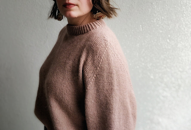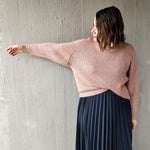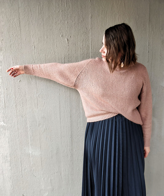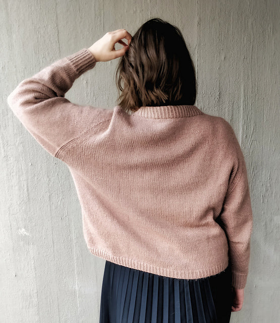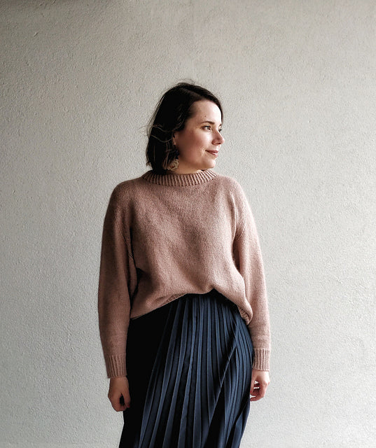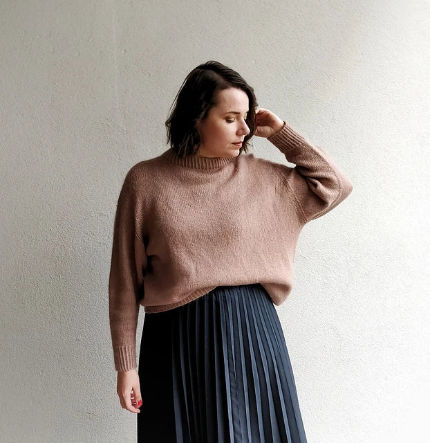 Den AUER SWEATER von Sari Nordlund strickst Du nahtlos von oben nach unten mit Nadelstärke 4mm (Bündchen 3,5mm). Das Halsbündchen strickst Du doppelt und die Passe formst Du mit Raglanzunahmen. Sari's Sweater ist gestrickt aus Merino mit Soft Silk Mohair beides in der Farbe rosa-ler / rose clay.