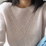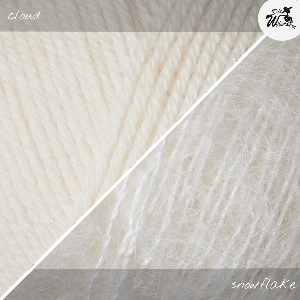 Den RibWave Sweater von Joanna Aug strickst Du nahtlos von oben nach unten mit Nadelstärke 4mm (Bündchen 3mm). Die Passe mit überzogenen Schultern strickst Du jeweils für sich in Reihen, am Hals sorgen German short Rows (verkürzte Reihen) für eine bessere Passform. Ab den Armausschnitten geht’s dann weiter in Runden. Für die Ärmel nimmst Du am Schluss aus den Armausschnitten Maschen auf und strickst sie jeweils für sich herunter. Joanna’s Bluse ist gestrickt aus Merino in der Farbe cloud / sky zusammen mit Soft Silk Mohair soft rose / pudderrosa. Das Merinogarn von Knitting for Olive ist selbstverständlich mulesingfrei und wird in Kombination mit Soft Silk Mohair von Knitting for Olive leicht flauschig und herrlich leicht. Beide Garne sind ökotex zertifiziert.