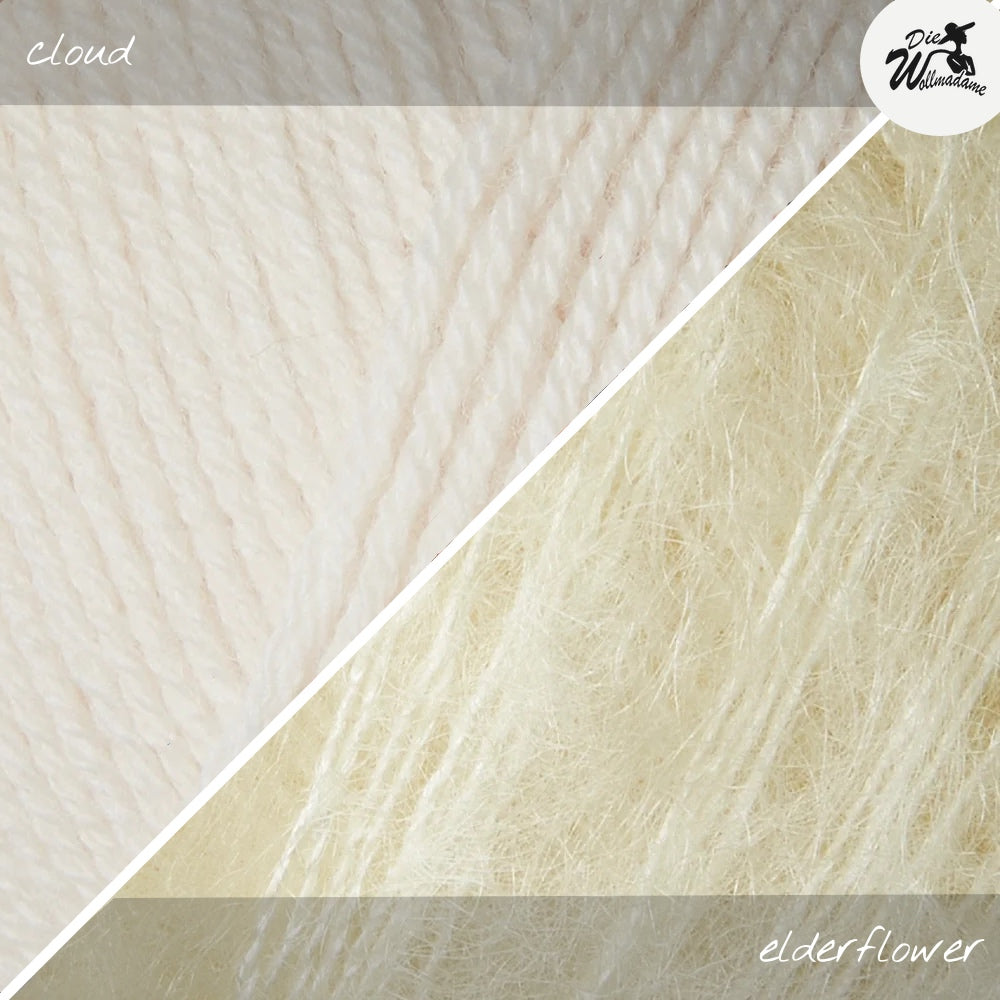 Den RibWave Sweater von Joanna Aug strickst Du nahtlos von oben nach unten mit Nadelstärke 4mm (Bündchen 3mm). Die Passe mit überzogenen Schultern strickst Du jeweils für sich in Reihen, am Hals sorgen German short Rows (verkürzte Reihen) für eine bessere Passform. Ab den Armausschnitten geht’s dann weiter in Runden. Für die Ärmel nimmst Du am Schluss aus den Armausschnitten Maschen auf und strickst sie jeweils für sich herunter. Joanna’s Bluse ist gestrickt aus Merino in der Farbe cloud / sky zusammen mit Soft Silk Mohair soft rose / pudderrosa. Das Merinogarn von Knitting for Olive ist selbstverständlich mulesingfrei und wird in Kombination mit Soft Silk Mohair von Knitting for Olive leicht flauschig und herrlich leicht. Beide Garne sind ökotex zertifiziert.