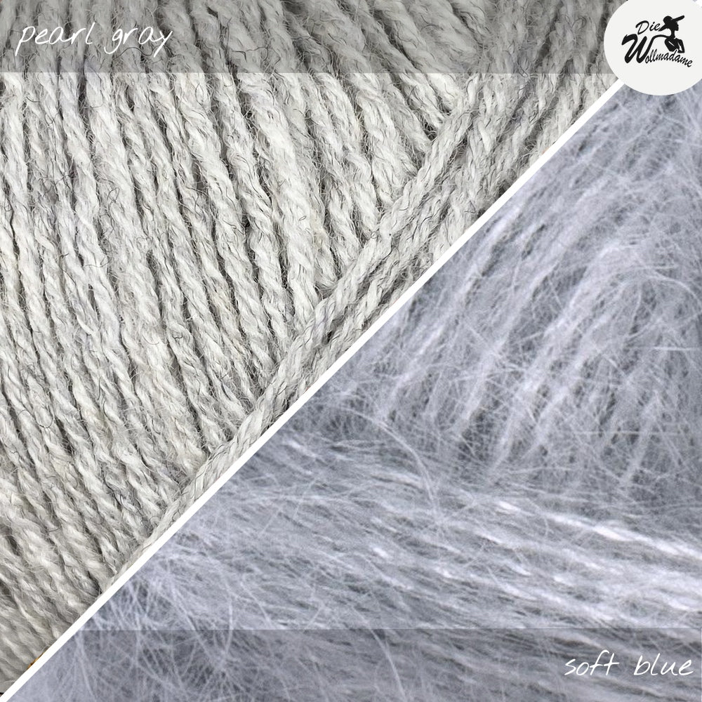 Den RibWave Sweater von Joanna Aug strickst Du nahtlos von oben nach unten mit Nadelstärke 4mm (Bündchen 3mm). Die Passe mit überzogenen Schultern strickst Du jeweils für sich in Reihen, am Hals sorgen German short Rows (verkürzte Reihen) für eine bessere Passform. Ab den Armausschnitten geht’s dann weiter in Runden. Für die Ärmel nimmst Du am Schluss aus den Armausschnitten Maschen auf und strickst sie jeweils für sich herunter. Joanna’s Bluse ist gestrickt aus Merino in der Farbe cloud / sky zusammen mit Soft Silk Mohair soft rose / pudderrosa. Das Merinogarn von Knitting for Olive ist selbstverständlich mulesingfrei und wird in Kombination mit Soft Silk Mohair von Knitting for Olive leicht flauschig und herrlich leicht. Beide Garne sind ökotex zertifiziert.