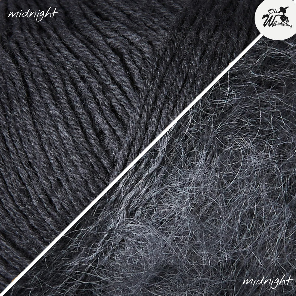 Den RibWave Sweater von Joanna Aug strickst Du nahtlos von oben nach unten mit Nadelstärke 4mm (Bündchen 3mm). Die Passe mit überzogenen Schultern strickst Du jeweils für sich in Reihen, am Hals sorgen German short Rows (verkürzte Reihen) für eine bessere Passform. Ab den Armausschnitten geht’s dann weiter in Runden. Für die Ärmel nimmst Du am Schluss aus den Armausschnitten Maschen auf und strickst sie jeweils für sich herunter. Joanna’s Bluse ist gestrickt aus Merino in der Farbe cloud / sky zusammen mit Soft Silk Mohair soft rose / pudderrosa. Das Merinogarn von Knitting for Olive ist selbstverständlich mulesingfrei und wird in Kombination mit Soft Silk Mohair von Knitting for Olive leicht flauschig und herrlich leicht. Beide Garne sind ökotex zertifiziert.
