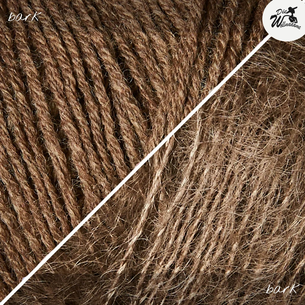 Den RibWave Sweater von Joanna Aug strickst Du nahtlos von oben nach unten mit Nadelstärke 4mm (Bündchen 3mm). Die Passe mit überzogenen Schultern strickst Du jeweils für sich in Reihen, am Hals sorgen German short Rows (verkürzte Reihen) für eine bessere Passform. Ab den Armausschnitten geht’s dann weiter in Runden. Für die Ärmel nimmst Du am Schluss aus den Armausschnitten Maschen auf und strickst sie jeweils für sich herunter. Joanna’s Bluse ist gestrickt aus Merino in der Farbe cloud / sky zusammen mit Soft Silk Mohair soft rose / pudderrosa. Das Merinogarn von Knitting for Olive ist selbstverständlich mulesingfrei und wird in Kombination mit Soft Silk Mohair von Knitting for Olive leicht flauschig und herrlich leicht. Beide Garne sind ökotex zertifiziert.