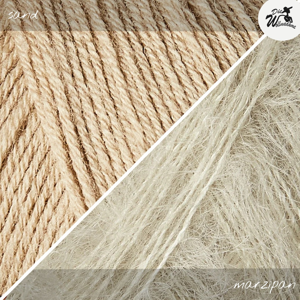 Den RibWave Sweater von Joanna Aug strickst Du nahtlos von oben nach unten mit Nadelstärke 4mm (Bündchen 3mm). Die Passe mit überzogenen Schultern strickst Du jeweils für sich in Reihen, am Hals sorgen German short Rows (verkürzte Reihen) für eine bessere Passform. Ab den Armausschnitten geht’s dann weiter in Runden. Für die Ärmel nimmst Du am Schluss aus den Armausschnitten Maschen auf und strickst sie jeweils für sich herunter. Joanna’s Bluse ist gestrickt aus Merino in der Farbe cloud / sky zusammen mit Soft Silk Mohair soft rose / pudderrosa. Das Merinogarn von Knitting for Olive ist selbstverständlich mulesingfrei und wird in Kombination mit Soft Silk Mohair von Knitting for Olive leicht flauschig und herrlich leicht. Beide Garne sind ökotex zertifiziert.