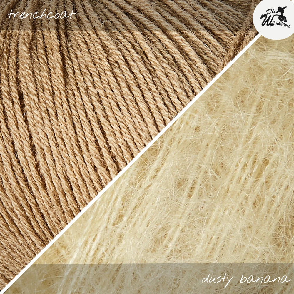 Den RibWave Sweater von Joanna Aug strickst Du nahtlos von oben nach unten mit Nadelstärke 4mm (Bündchen 3mm). Die Passe mit überzogenen Schultern strickst Du jeweils für sich in Reihen, am Hals sorgen German short Rows (verkürzte Reihen) für eine bessere Passform. Ab den Armausschnitten geht’s dann weiter in Runden. Für die Ärmel nimmst Du am Schluss aus den Armausschnitten Maschen auf und strickst sie jeweils für sich herunter. Joanna’s Bluse ist gestrickt aus Merino in der Farbe cloud / sky zusammen mit Soft Silk Mohair soft rose / pudderrosa. Das Merinogarn von Knitting for Olive ist selbstverständlich mulesingfrei und wird in Kombination mit Soft Silk Mohair von Knitting for Olive leicht flauschig und herrlich leicht. Beide Garne sind ökotex zertifiziert.