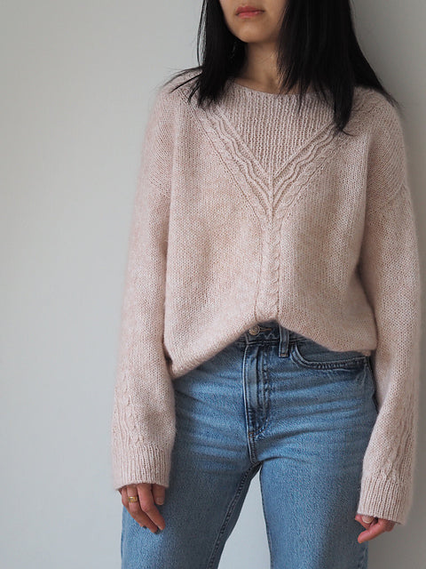 Den RibWave Sweater von Joanna Aug strickst Du nahtlos von oben nach unten mit Nadelstärke 4mm (Bündchen 3mm). Die Passe mit überzogenen Schultern strickst Du jeweils für sich in Reihen, am Hals sorgen German short Rows (verkürzte Reihen) für eine bessere Passform. Ab den Armausschnitten geht’s dann weiter in Runden. Für die Ärmel nimmst Du am Schluss aus den Armausschnitten Maschen auf und strickst sie jeweils für sich herunter. Joanna’s Bluse ist gestrickt aus Merino in der Farbe cloud / sky zusammen mit Soft Silk Mohair soft rose / pudderrosa. Das Merinogarn von Knitting for Olive ist selbstverständlich mulesingfrei und wird in Kombination mit Soft Silk Mohair von Knitting for Olive leicht flauschig und herrlich leicht. Beide Garne sind ökotex zertifiziert.