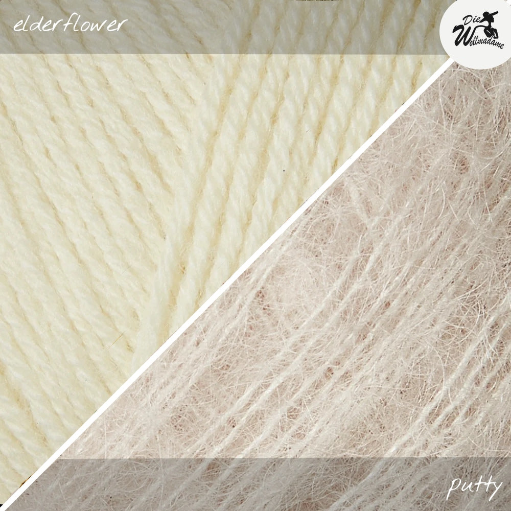 Den RibWave Sweater von Joanna Aug strickst Du nahtlos von oben nach unten mit Nadelstärke 4mm (Bündchen 3mm). Die Passe mit überzogenen Schultern strickst Du jeweils für sich in Reihen, am Hals sorgen German short Rows (verkürzte Reihen) für eine bessere Passform. Ab den Armausschnitten geht’s dann weiter in Runden. Für die Ärmel nimmst Du am Schluss aus den Armausschnitten Maschen auf und strickst sie jeweils für sich herunter. Joanna’s Bluse ist gestrickt aus Merino in der Farbe cloud / sky zusammen mit Soft Silk Mohair soft rose / pudderrosa. Das Merinogarn von Knitting for Olive ist selbstverständlich mulesingfrei und wird in Kombination mit Soft Silk Mohair von Knitting for Olive leicht flauschig und herrlich leicht. Beide Garne sind ökotex zertifiziert.