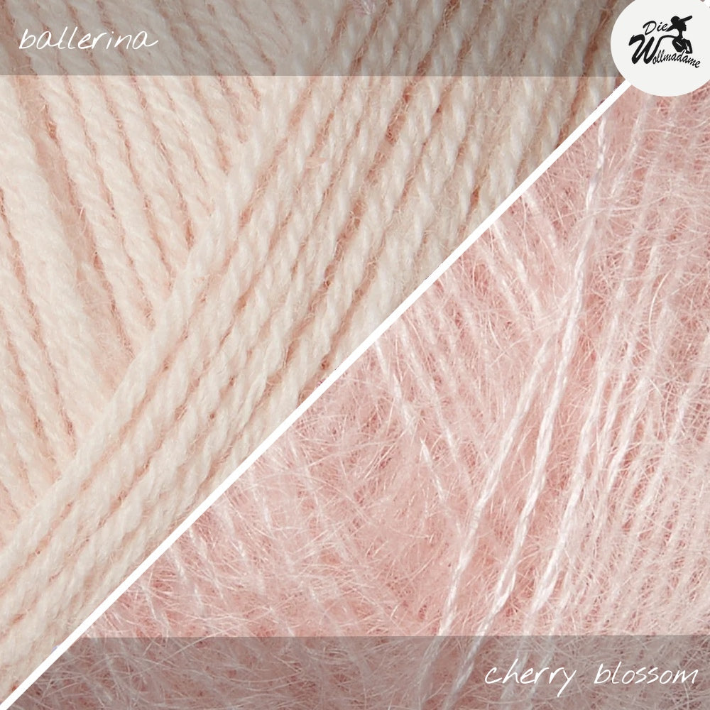 Den RibWave Sweater von Joanna Aug strickst Du nahtlos von oben nach unten mit Nadelstärke 4mm (Bündchen 3mm). Die Passe mit überzogenen Schultern strickst Du jeweils für sich in Reihen, am Hals sorgen German short Rows (verkürzte Reihen) für eine bessere Passform. Ab den Armausschnitten geht’s dann weiter in Runden. Für die Ärmel nimmst Du am Schluss aus den Armausschnitten Maschen auf und strickst sie jeweils für sich herunter. Joanna’s Bluse ist gestrickt aus Merino in der Farbe cloud / sky zusammen mit Soft Silk Mohair soft rose / pudderrosa. Das Merinogarn von Knitting for Olive ist selbstverständlich mulesingfrei und wird in Kombination mit Soft Silk Mohair von Knitting for Olive leicht flauschig und herrlich leicht. Beide Garne sind ökotex zertifiziert.