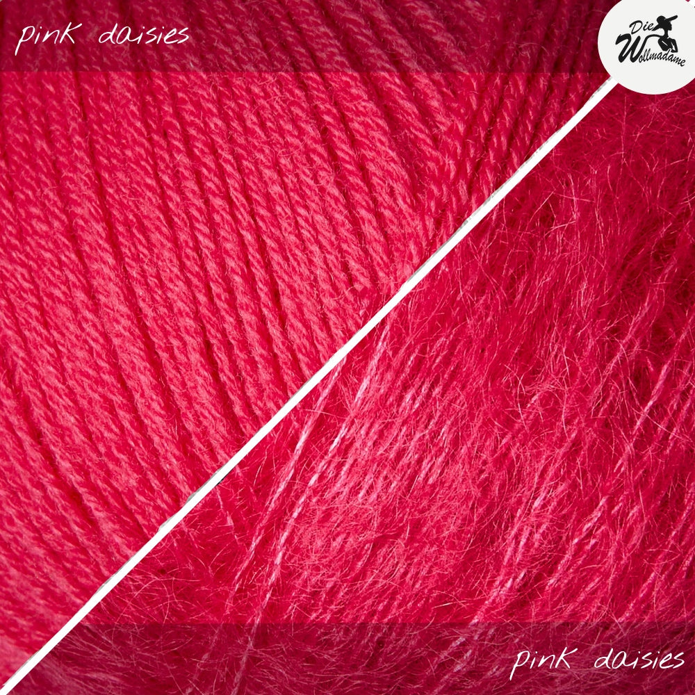 Den RibWave Sweater von Joanna Aug strickst Du nahtlos von oben nach unten mit Nadelstärke 4mm (Bündchen 3mm). Die Passe mit überzogenen Schultern strickst Du jeweils für sich in Reihen, am Hals sorgen German short Rows (verkürzte Reihen) für eine bessere Passform. Ab den Armausschnitten geht’s dann weiter in Runden. Für die Ärmel nimmst Du am Schluss aus den Armausschnitten Maschen auf und strickst sie jeweils für sich herunter. Joanna’s Bluse ist gestrickt aus Merino in der Farbe cloud / sky zusammen mit Soft Silk Mohair soft rose / pudderrosa. Das Merinogarn von Knitting for Olive ist selbstverständlich mulesingfrei und wird in Kombination mit Soft Silk Mohair von Knitting for Olive leicht flauschig und herrlich leicht. Beide Garne sind ökotex zertifiziert.