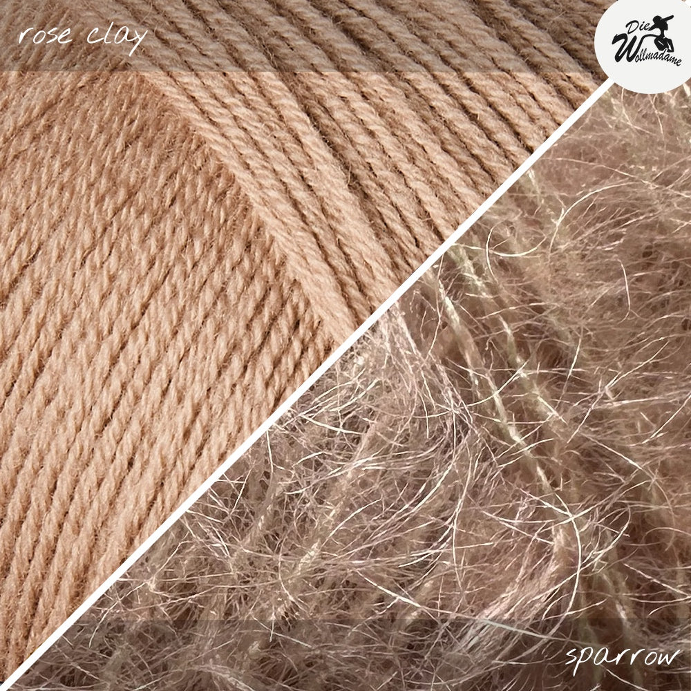 Den RibWave Sweater von Joanna Aug strickst Du nahtlos von oben nach unten mit Nadelstärke 4mm (Bündchen 3mm). Die Passe mit überzogenen Schultern strickst Du jeweils für sich in Reihen, am Hals sorgen German short Rows (verkürzte Reihen) für eine bessere Passform. Ab den Armausschnitten geht’s dann weiter in Runden. Für die Ärmel nimmst Du am Schluss aus den Armausschnitten Maschen auf und strickst sie jeweils für sich herunter. Joanna’s Bluse ist gestrickt aus Merino in der Farbe cloud / sky zusammen mit Soft Silk Mohair soft rose / pudderrosa. Das Merinogarn von Knitting for Olive ist selbstverständlich mulesingfrei und wird in Kombination mit Soft Silk Mohair von Knitting for Olive leicht flauschig und herrlich leicht. Beide Garne sind ökotex zertifiziert.