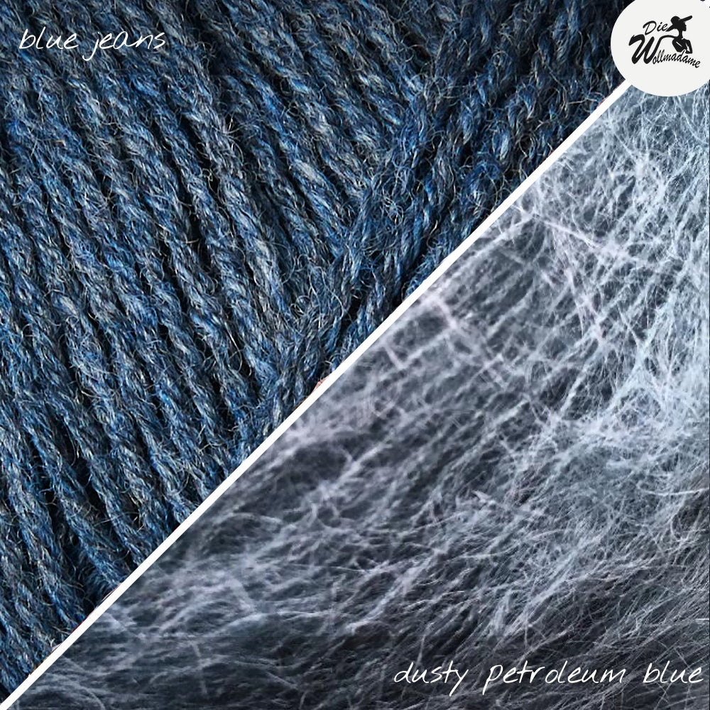 Den RibWave Sweater von Joanna Aug strickst Du nahtlos von oben nach unten mit Nadelstärke 4mm (Bündchen 3mm). Die Passe mit überzogenen Schultern strickst Du jeweils für sich in Reihen, am Hals sorgen German short Rows (verkürzte Reihen) für eine bessere Passform. Ab den Armausschnitten geht’s dann weiter in Runden. Für die Ärmel nimmst Du am Schluss aus den Armausschnitten Maschen auf und strickst sie jeweils für sich herunter. Joanna’s Bluse ist gestrickt aus Merino in der Farbe cloud / sky zusammen mit Soft Silk Mohair soft rose / pudderrosa. Das Merinogarn von Knitting for Olive ist selbstverständlich mulesingfrei und wird in Kombination mit Soft Silk Mohair von Knitting for Olive leicht flauschig und herrlich leicht. Beide Garne sind ökotex zertifiziert.