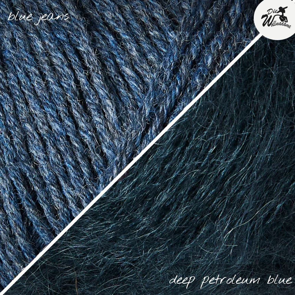 Den RibWave Sweater von Joanna Aug strickst Du nahtlos von oben nach unten mit Nadelstärke 4mm (Bündchen 3mm). Die Passe mit überzogenen Schultern strickst Du jeweils für sich in Reihen, am Hals sorgen German short Rows (verkürzte Reihen) für eine bessere Passform. Ab den Armausschnitten geht’s dann weiter in Runden. Für die Ärmel nimmst Du am Schluss aus den Armausschnitten Maschen auf und strickst sie jeweils für sich herunter. Joanna’s Bluse ist gestrickt aus Merino in der Farbe cloud / sky zusammen mit Soft Silk Mohair soft rose / pudderrosa. Das Merinogarn von Knitting for Olive ist selbstverständlich mulesingfrei und wird in Kombination mit Soft Silk Mohair von Knitting for Olive leicht flauschig und herrlich leicht. Beide Garne sind ökotex zertifiziert.