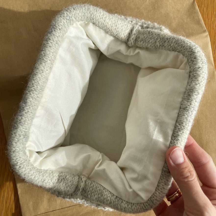 Das originale, bereits fertig genähte Futter aus Bio-Baumwollpopelin von Petite Knit kommt in einer kompostierbaren und plastikfreien NatureFlex® Tüte mit einem Weblabel. Nähe das weiche Futter einfach in die Tasche - kein Zuschneiden etc. nötig. Passt zur Winter Clutch, kleinen Teddy Clutch und kleinen Cleo Clutch von PetiteKnit.