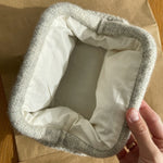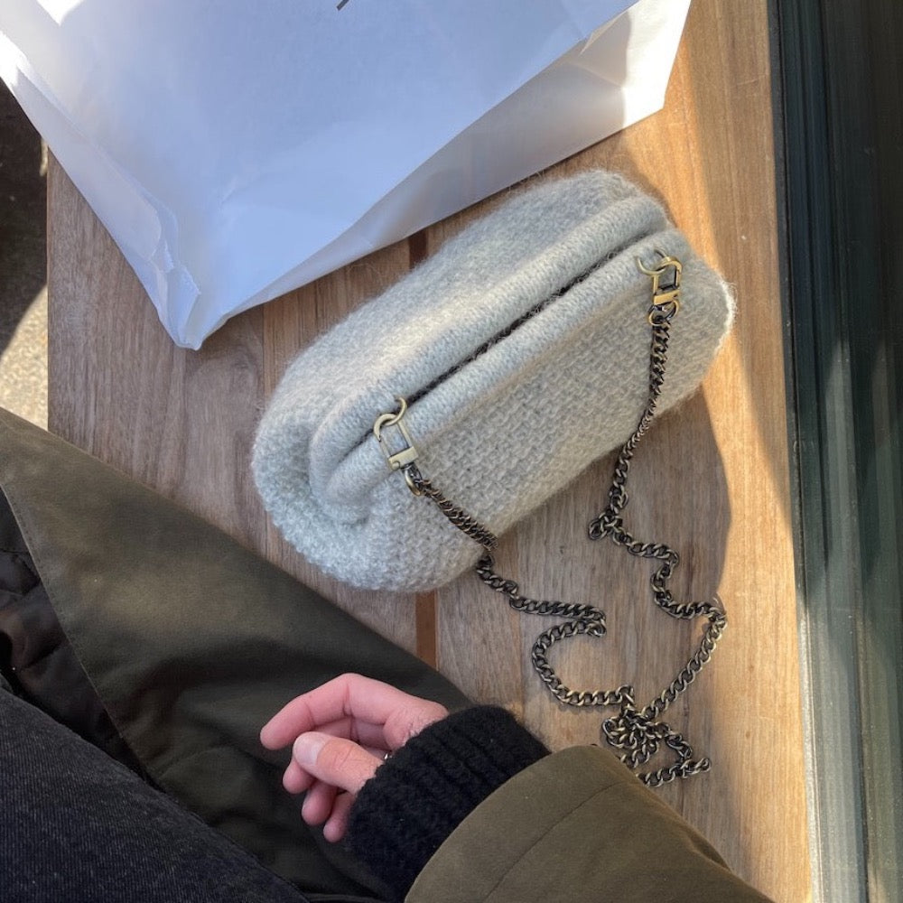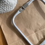 Der originale Verschluss-Rahmen von Petite Knit kommt in einer Papiertüte verpackt mit Weblabel. Der Rahmen besteht aus Aluminium und passt zu den Anleitungen Winter Clutch, die kleine Teddy Clutch und die kleine Cleo Clutch von PetiteKnit.