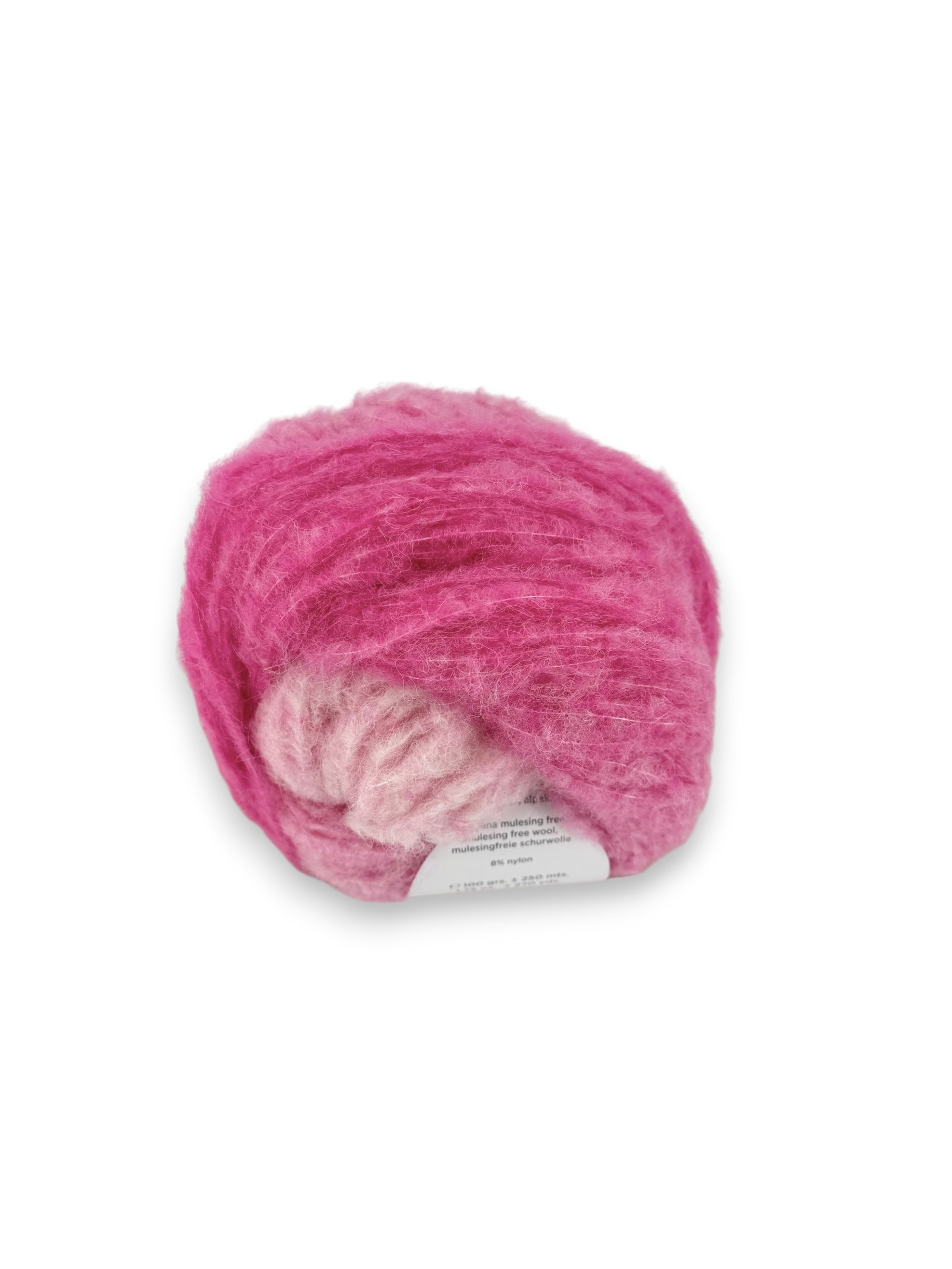 Farbe 5 beginnt in einem zarten, pudrigen Rosa und intensiviert sich Stück für Stück bis hin zu einem kräftigen Pink. Die Übergänge wirken weich und harmonisch, sodass das Maschenbild lebendig, aber nicht unruhig erscheint. Der Verlauf verleiht Projekten eine feminine, frische Ausstrahlung – von sanft verspielt bis hin zu modern leuchtend. Besonders schön kommt er bei großen Flächen wie Pullovern oder Schals zur Geltung, wo sich der gesamte Übergang von Hell nach Dunkel entfalten kann.