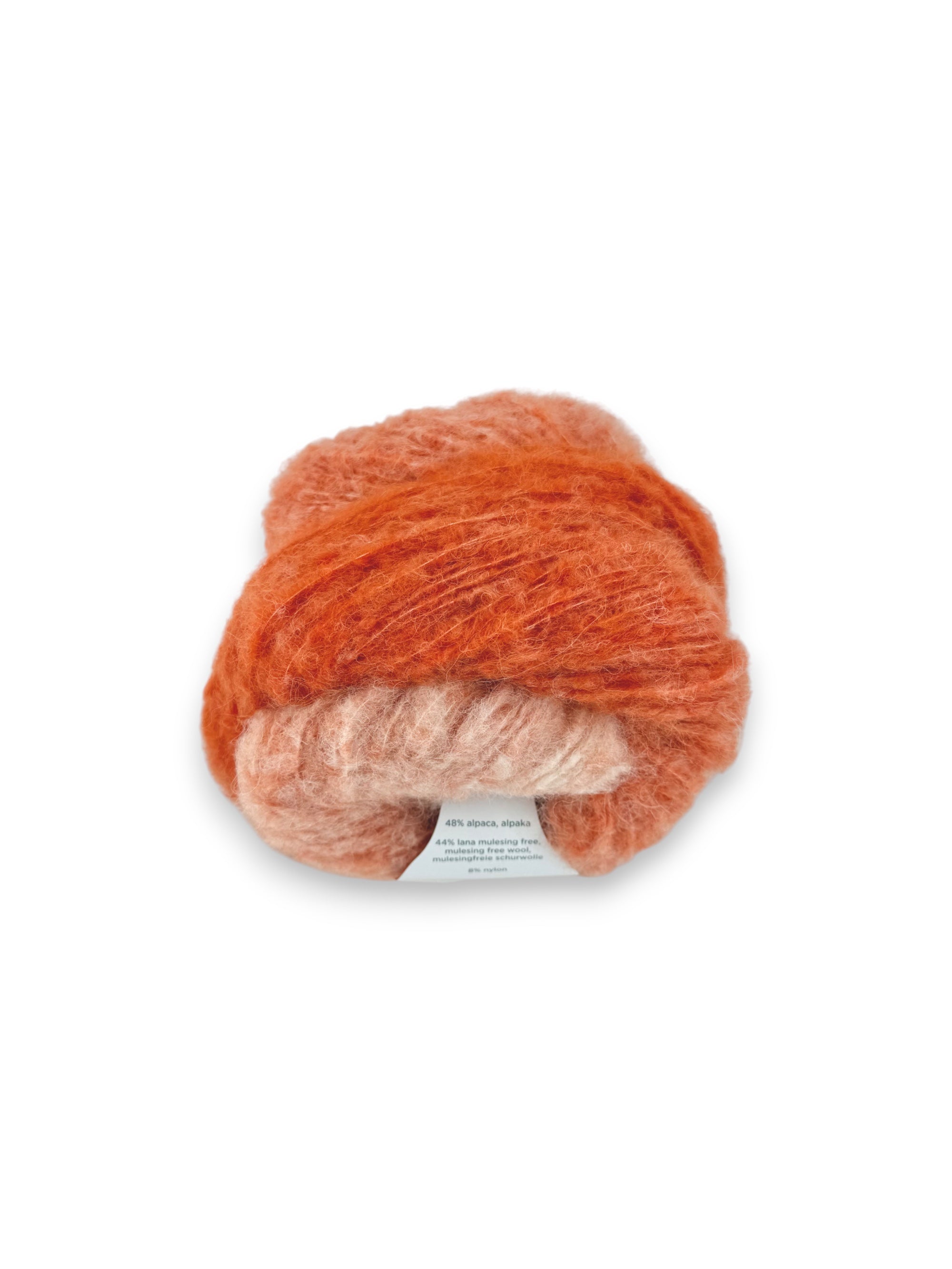 Farbe 3 beginnt in einem sanften Cremeton, geht über in zartes Pfirsich und endet in einem lebendigen Orange. Diese warme Kombination wirkt freundlich und strahlend, ohne aufdringlich zu sein. Die fließenden Übergänge schaffen ein harmonisches Maschenbild, das Projekten eine frische und sommerliche Ausstrahlung verleiht. Besonders schön kommt der Verlauf bei Oberteilen oder Accessoires zur Geltung, wo sich die weichen Farbwechsel großzügig entfalten können.