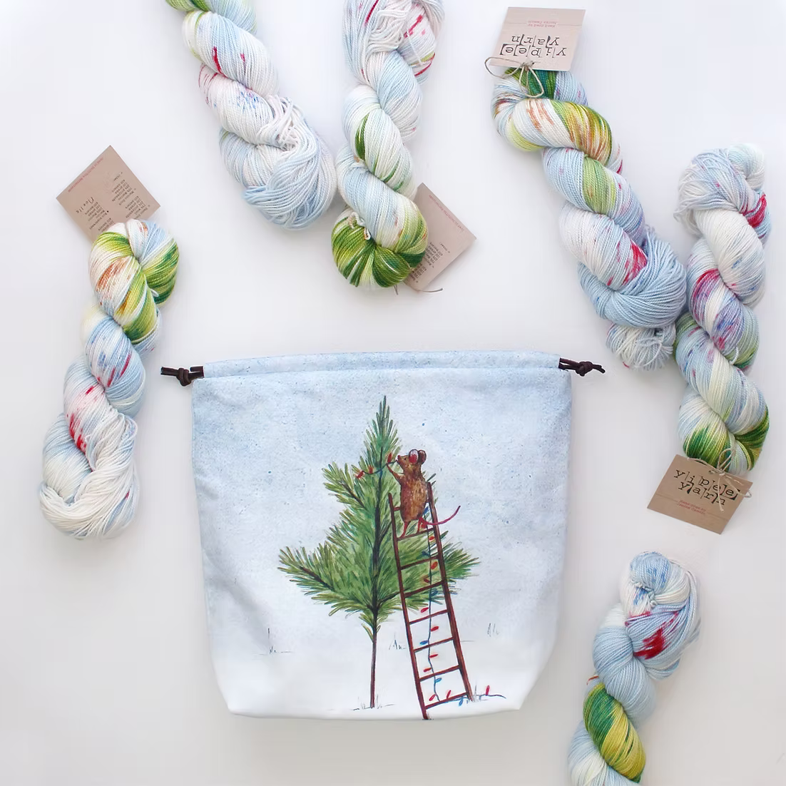Dieser Projektbeutel mit Illustration von The Blue Rabbit House ist nicht nur praktisch, sondern auch ein echter Hingucker. Die Illustration zeigt eine kleine Maus die den Weihnachtsbaum mit Hilfe einer Leiter dekoriert – liebevoll und detailreich gestaltet bringt das Freude nicht nur in den Strick- und Häkelalltag.
