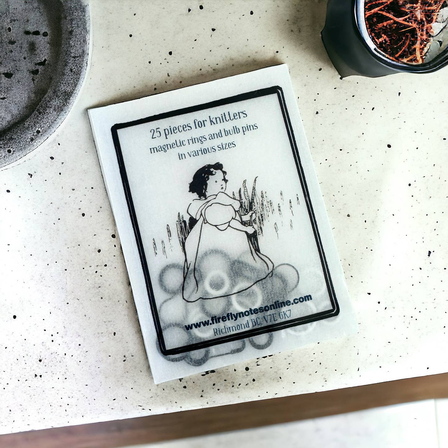 Insgesamt 25 hochwertige, glatte, magnetische Maschenmarkierer aus Metall kommen in einer kleinen Papiertüte mit Vintagedruck.