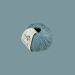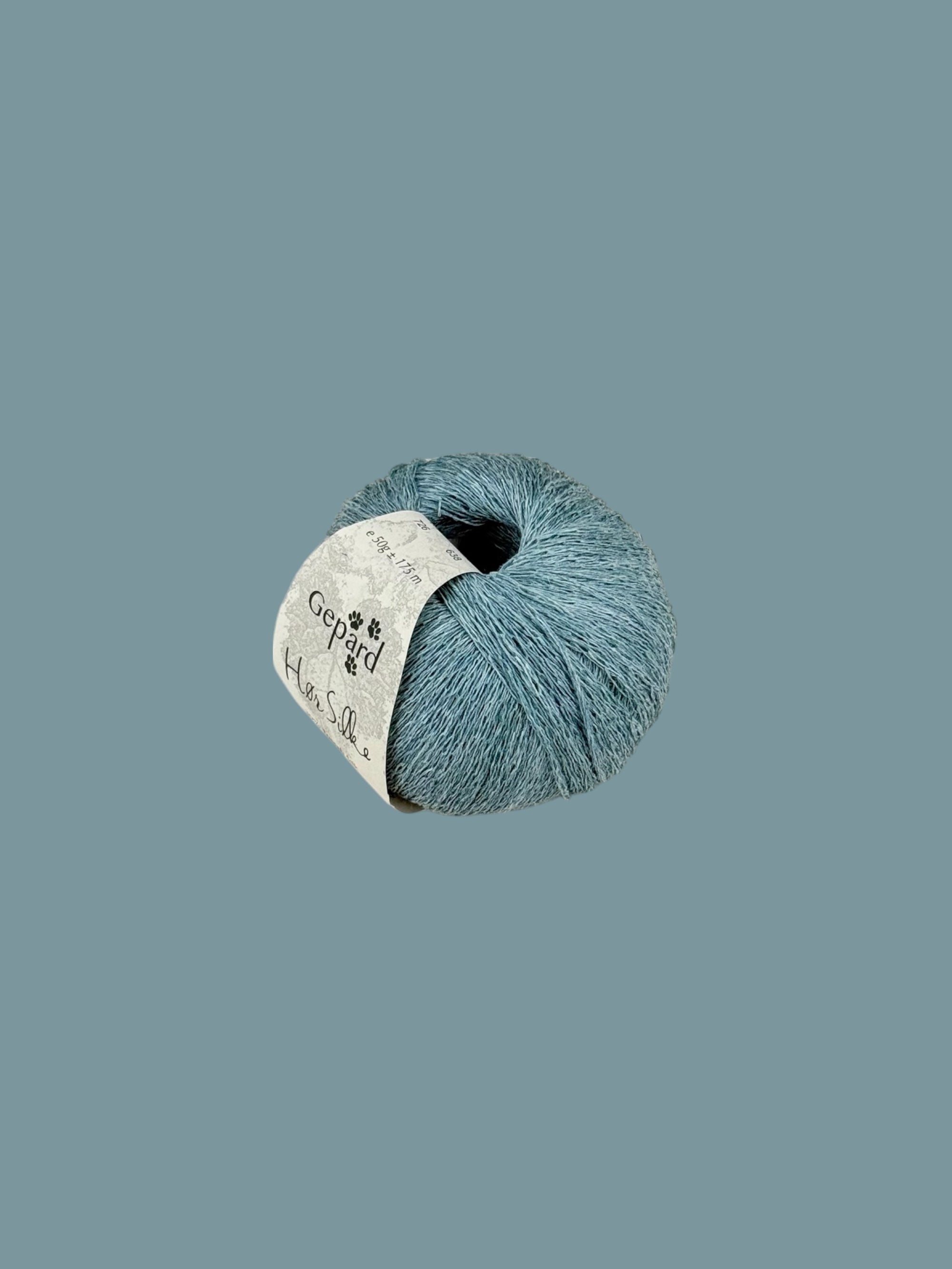 Ein kühles Blaugrau mit feiner Melierung in Petrol, Türkis und einem Hauch Mint. Die lebendige Mischung erinnert an Meeresgestein, das vom Wasser geschliffen wurde – vielschichtig, ruhig und angenehm modern. Die Kombination aus Leinen und Seide unterstreicht die elegante Struktur des Garns und verleiht der Nuance eine klare Frische mit dezentem Glanz.