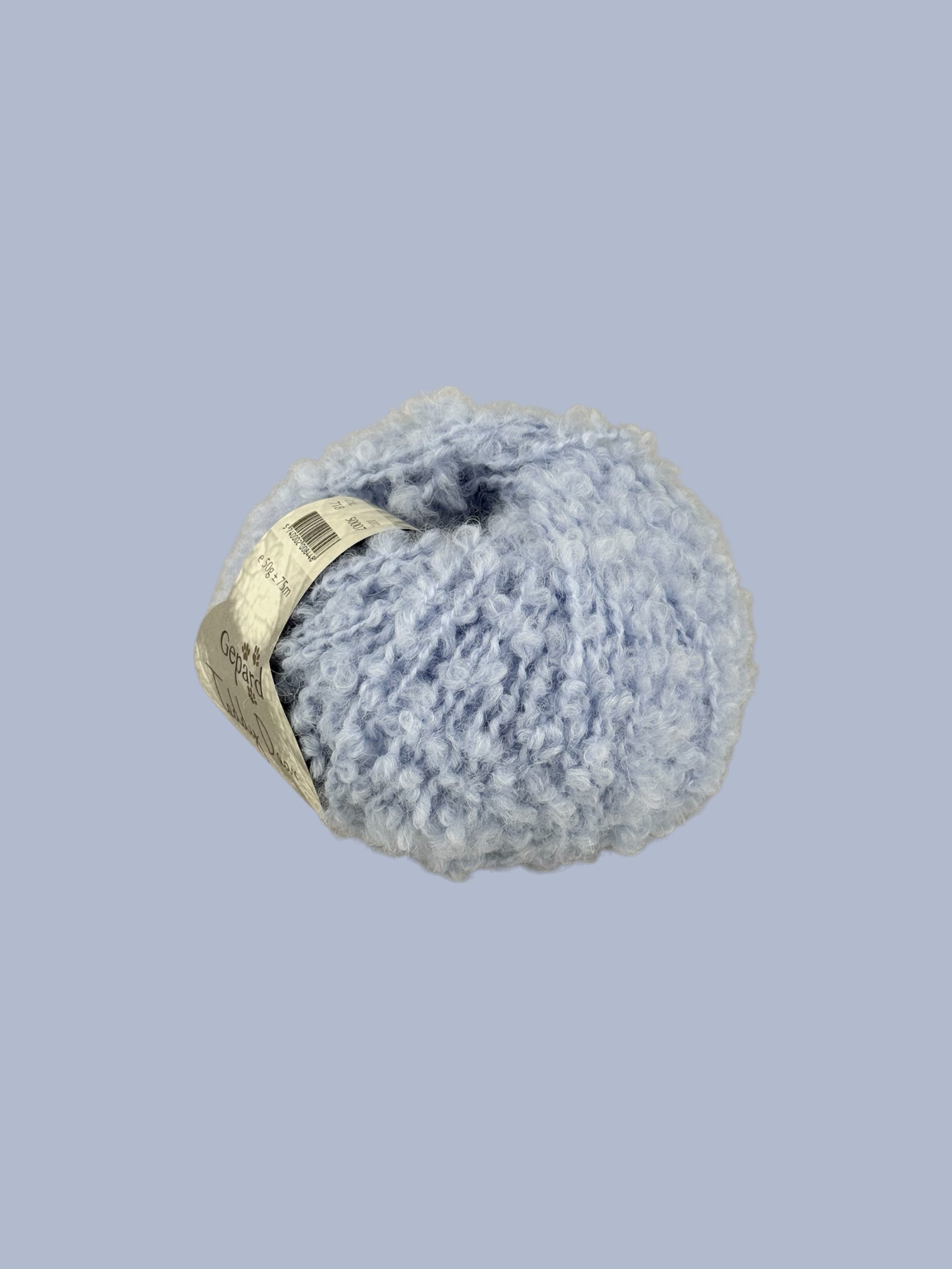 Ein kühles, helles Blau mit ruhiger Ausstrahlung. Die Farbe erinnert an verwaschenes Eisblau oder blassen Himmel am frühen Morgen – klar, zurückhaltend und angenehm weich. Die flauschige Garnstruktur unterstreicht die Sanftheit der Nuance und macht sie ideal für zeitlose Strickstücke mit leichter Frische.